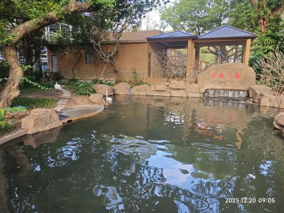 再往前面,看到一块棕黄色大石,上面刻着“飞禽大观”四个红色大字,字体飘逸,潺潺流水沿着大石底部的石阶垂直流进石前的小湖。湖水清绿,湖里成群的锦鲤在游玩,湖上白天鹅在嬉戏。进入“飞禽大观”园区,可以看到一间间供鸟居住的房子,房子里面有各种树草和供鸟休闲歇息的设备,居住环境很好。鸟房的顶部和正面用铁网围住的,这样游客就可以透过围网观看里面的各种鸟。在这里可以看到各种各样的鹦鹉,有的颜色五彩缤纷,有的个头非常大,还有很多其他鸟类,它们形态各异,不时做出各种姿态和发出各种鸣叫声。有些豪华大型的鸟房里还配有流水石头和各种树木,用透明玻璃与外界相隔,里面各种不同鸟类混合居住,形成一个整体的小生态。