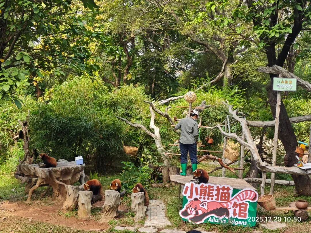 离开熊猫馆没多远,就来到了小熊猫园区。此时饲养员正在给小熊猫喂食。只见小熊猫站成一排,每个人一只碗,在津津有味地吃着碗里的食物,像幼儿园的小朋友一样,很是听话。园区内有各种木架子,上面的绳子吊着各种簸箕、竹篓等容器,饲养员在小熊猫进食期间,不断地往这些容器内放食物。等到小熊猫吃完自己碗里的食物后,它们就会继续攀爬到木架子上去翻找簸箕、竹篓里的食物继续吃,非常聪明,萌萌可爱的样子把观众们都逗乐了。