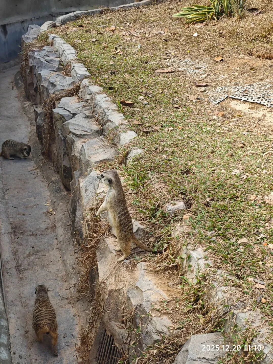 之后我们来到了狐獴的区域。只见一片凹下去的坑里面,有一群狐獴,此时它们正在各自寻找散落在地上的食物,看起来动作非常灵活。旁边的标志牌记载介绍说:“狐獴生活在南非的卡拉哈里沙漠,是一种非常社会化的动物,群落个体可达40只,擅长挖洞,群体中常有一些站立起来负责警惕的“哨兵”,有危险的时候会“鸣笛预警”。狐獴的眼睛周围都有着黑色块,这些构造的作用跟太阳眼镜相同,让它们在艳阳普照下仍能清晰的视物,甚至是直视太阳。夜晚休息白天活动,主要以昆虫为食,但它们也会吃蜥蜴、蛇、蜘蛛、植物、卵跟小型哺乳动物。”难怪现在是白天,它们也这么活跃,而且,还的真看到了一只正在非常警惕地站立在高处放哨的狐獴。