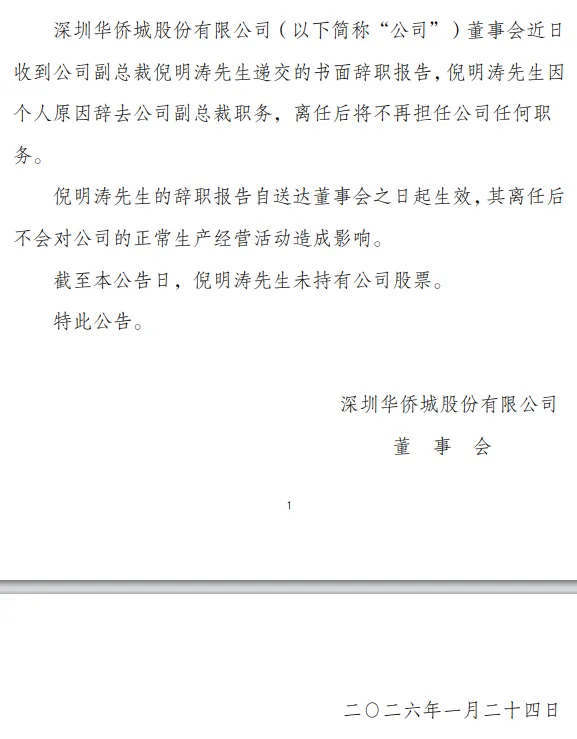 深圳华侨城股份有限公司关于副总裁离任的公告。