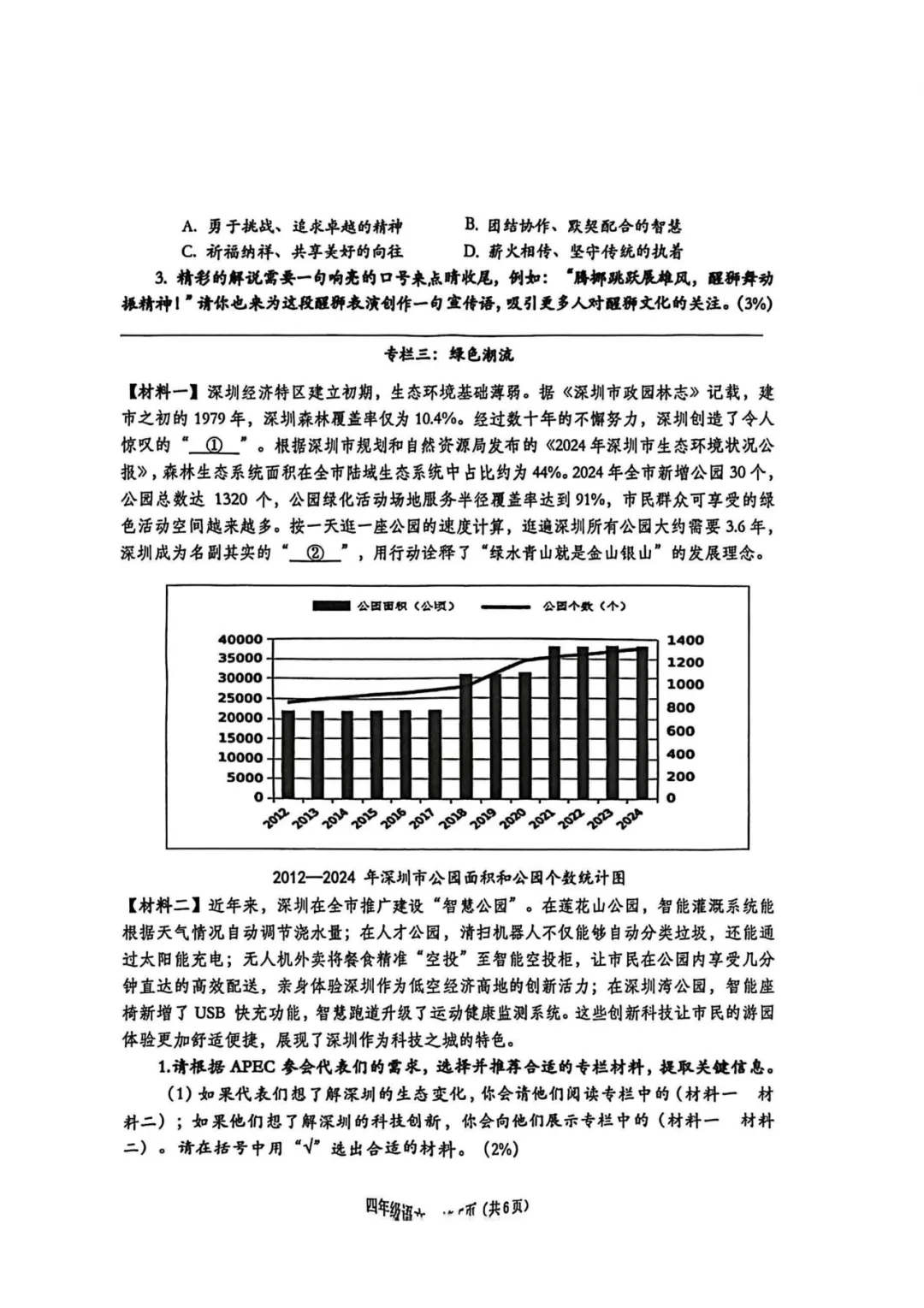南山区四年级语文试卷直接“杀疯”,全卷以“APEC深圳特刊小记者”为主线,穿插大量深圳新闻,6页纸、4000多字,还要在100分钟完成。
