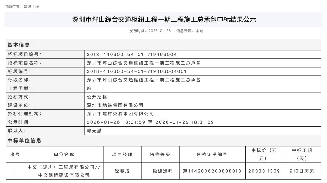 2026年1月26日,深圳坪山综合交通枢纽工程一期工程施工总承包的中标结果在深圳公共资源交易中心网站公示。根据公示,中标单位为中交(深圳)工程局有限公司、中交路桥建设有限公司组成的联合体,中标价为20383.1339万元,中标工期为913天。