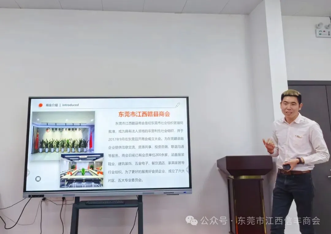 东莞市江西赣县商会秘书长肖诚飞通过PPT 的方式对商会进行了介绍。他从商会的发展状况、规划方向、目标设定、所获荣誉等方面展开阐述,表示东莞市江西赣县商会将致力于打造成为学习型、创新型、家庭型、公益型、实干型、服务型的商会。