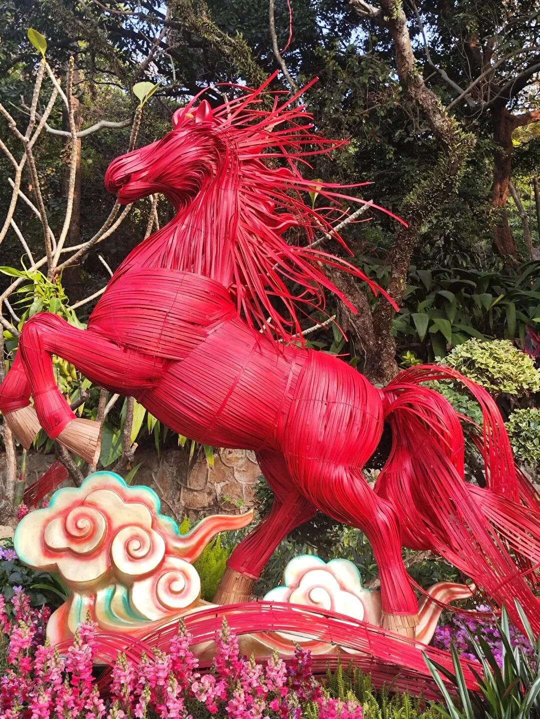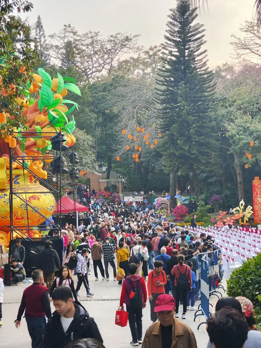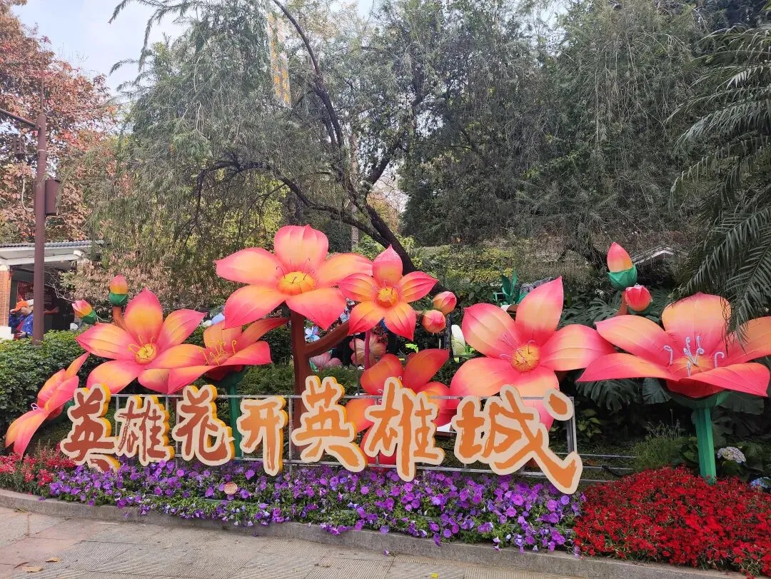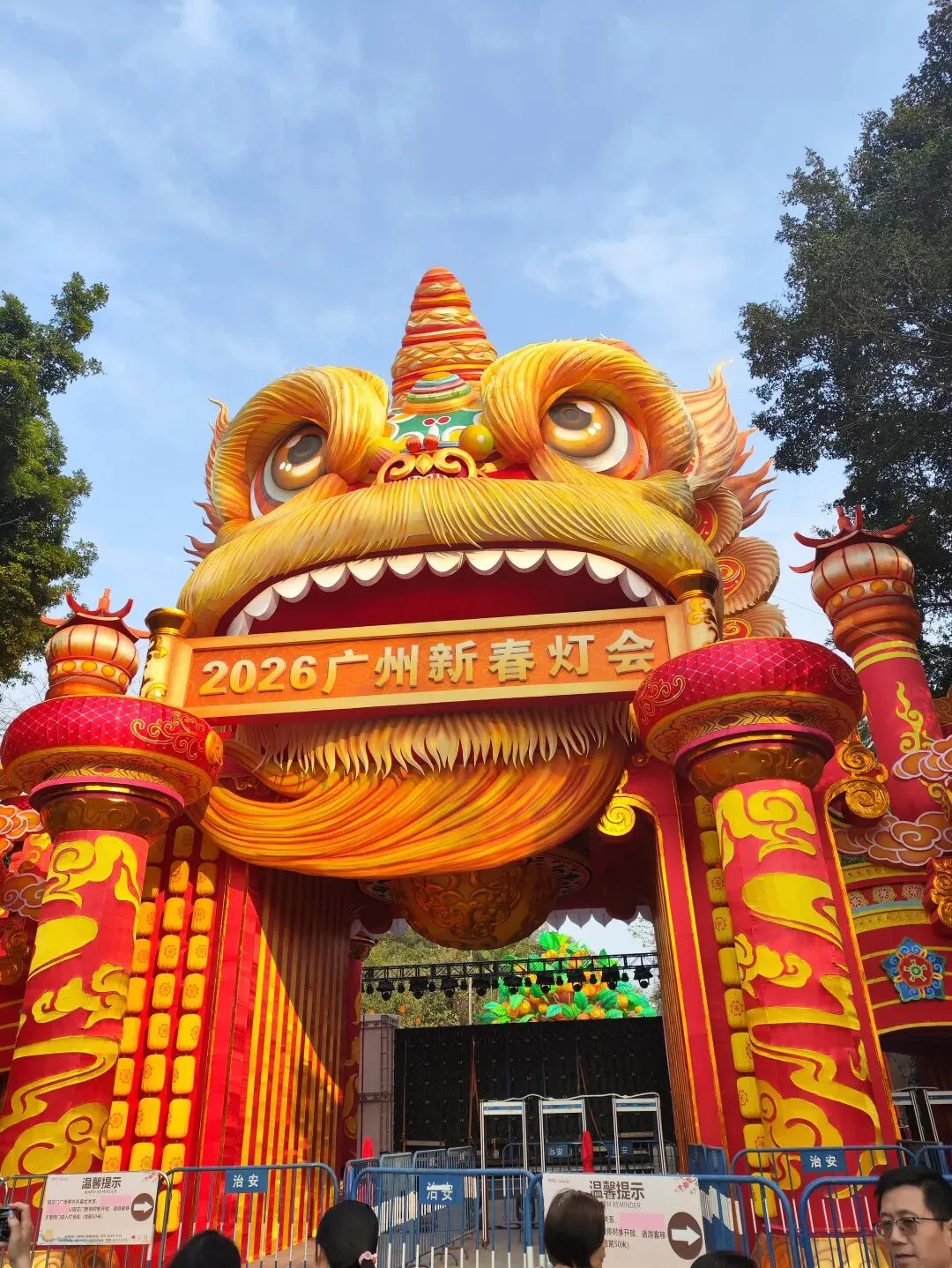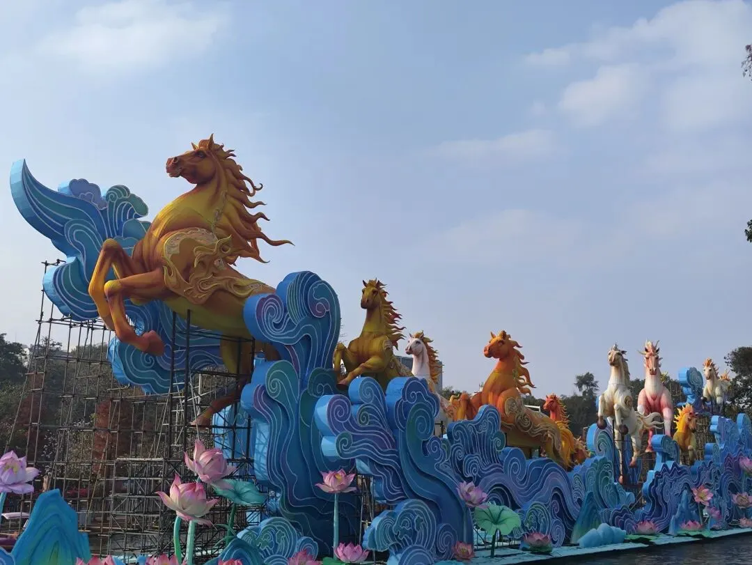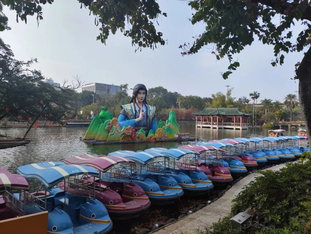 搭地铁一号线到公园前,转二号线2站到越秀公园B1出口。出来后跟着人群走,往右手边走。 正门的狮子头精神抖擞,非常霸气。之前因为狮子的眼睛👀半合上,在打瞌睡上新闻了,据说是亮灯和自然光时会有影响,有调试。 万马奔腾,步步生莲,英姿飒爽,亮灯肯定很光彩夺目。 超大花篮,去年荔湾花市就是个花篮,广州灯会传统存在,枝繁叶茂。 大部分树上,挂的是这种亮晶晶✨,阳光照射下会折射出闪耀的光。。。 这个人物矗立在水面上,看着很特别,年轻一辈的爱好,照顾下所有人的喜好。 公园有点小,趁还没亮灯收门票,赶紧去逛下。30号门票要40元一张,不太划算。租个小船绕着逛一圈,风景怡人。可惜没看到五羊雕像,跟着人群转了半圈,人多一直没有标志没看到。等灯会后,一整年都有空,去把五羊补看上。 大家过去要带好小孩老人,自备点水和零食。里面卖的奶茶五羊雪糕,风行牛奶便宜贵都有,但是物价偏高还得排队,建议自带。提前祝大家新春快乐,幸福美满🌹🌹