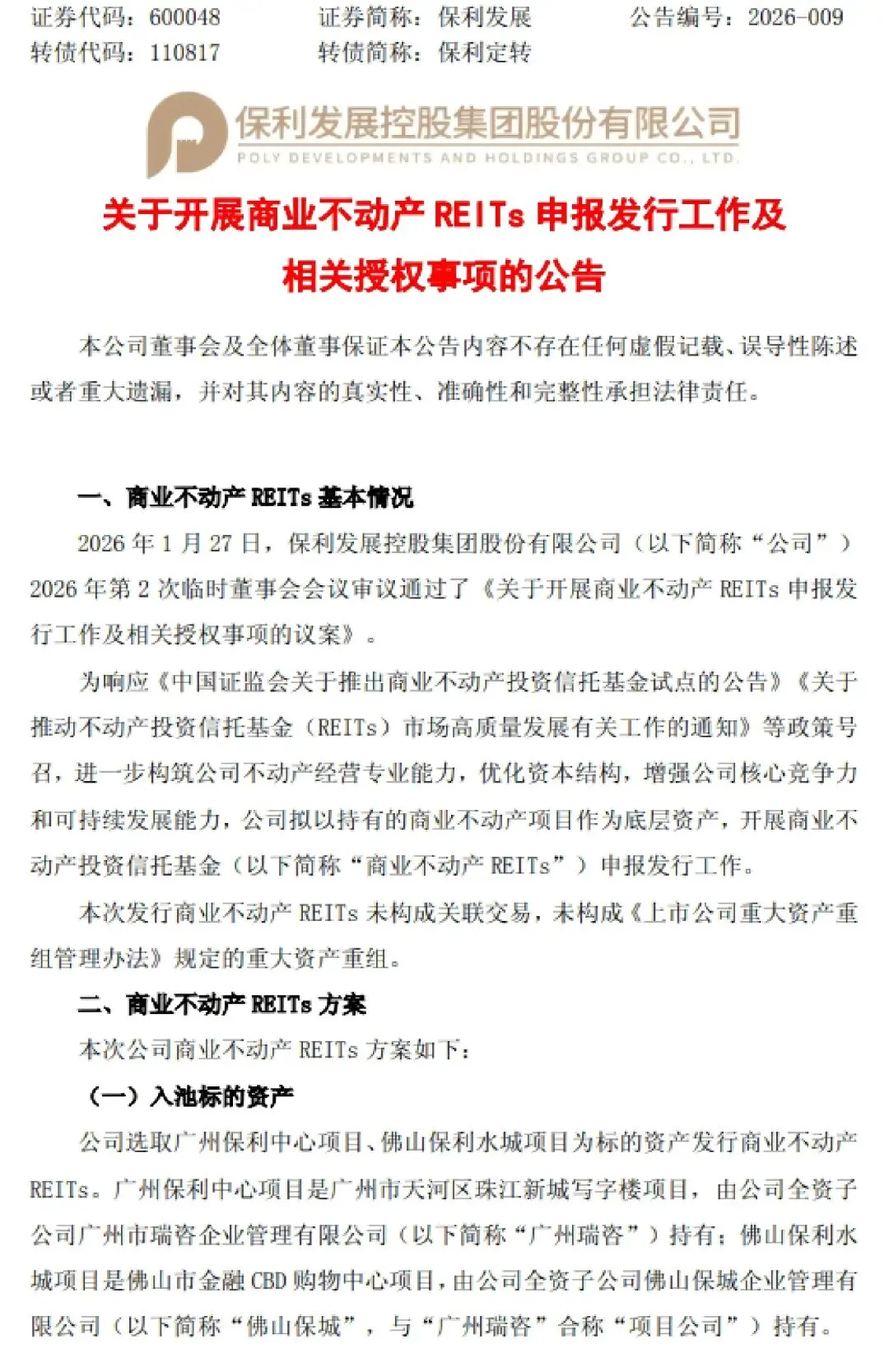 仅一个月后,保利发展(600048.SH)迅速行动,宣布拟发行以广州保利中心(甲级写字楼)与佛山保利水城(区域级购物中心)为核心的商业不动产REITs。这不仅是政策发布后的首个房企申报案例,更是A股历史上首单商业不动产REITs尝试。