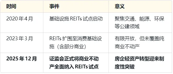 2025年12月31日,中国证监会发布《关于推出商业不动产投资信托基金试点的公告》,正式将购物中心、写字楼、酒店等经营性商业不动产纳入REITs试点范围——这是中国REITs市场自2020年启动以来最重大的扩容。