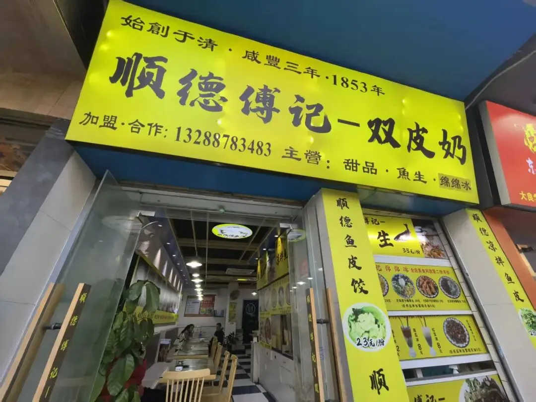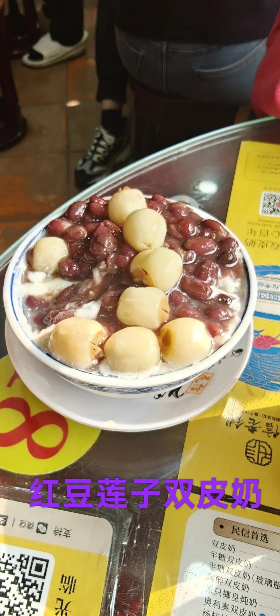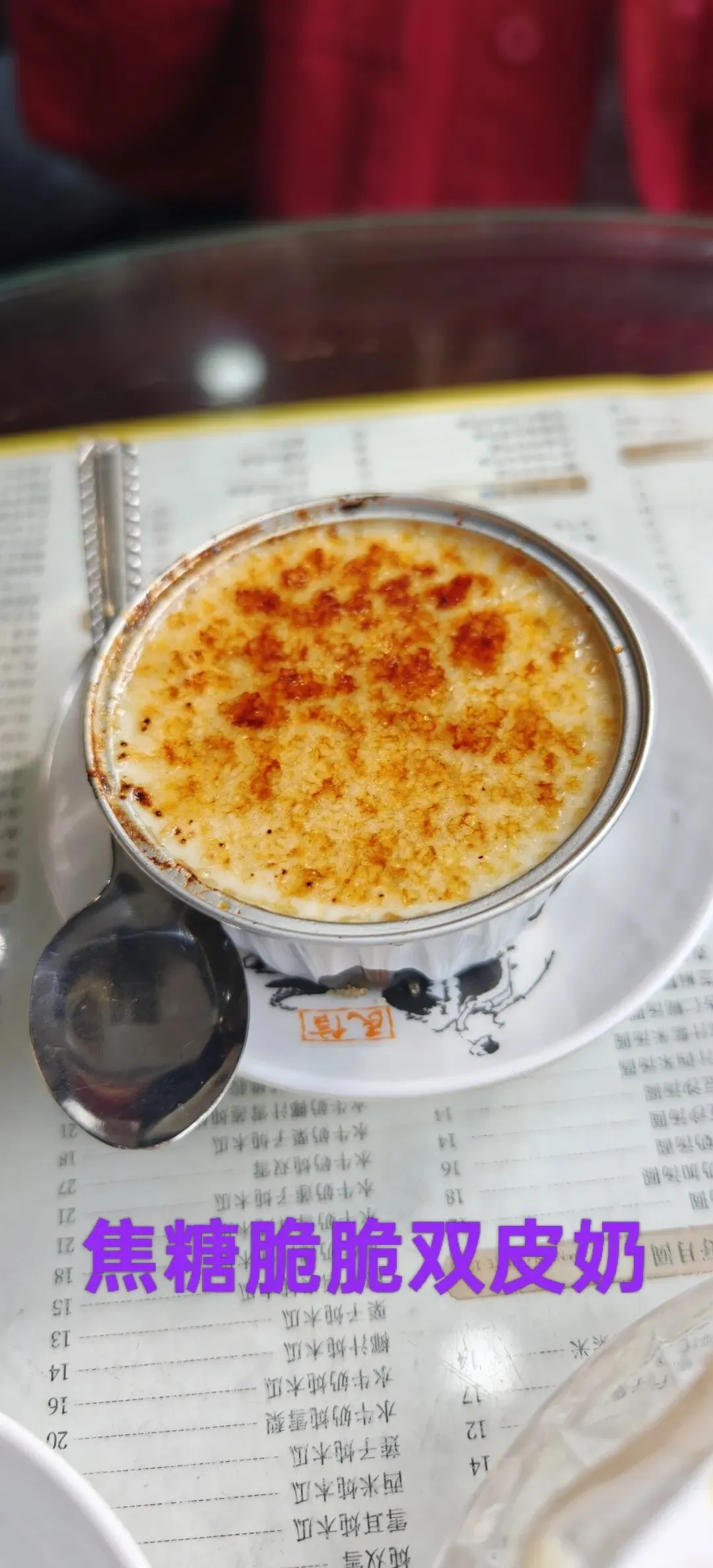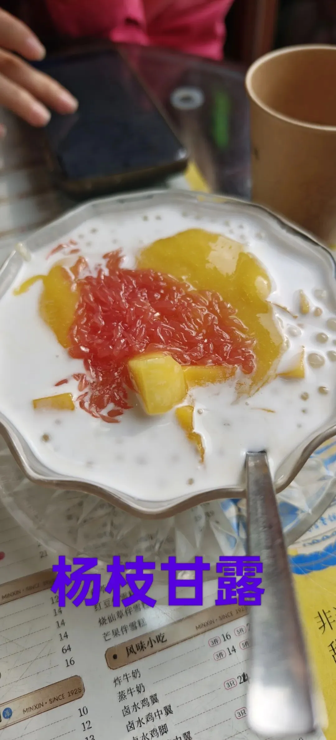 彩虹桥A口进坐8号线(万胜围方向)昌岗站下倒2号线(广州南站方向)广州南站下倒7号线(美的大道方向)北滘公园下倒3号线(顺德学院站方向)大良钟楼下A口出。这下可把地铁坐美了😁走到汉庭酒店(佛山顺德清晖园景区店)用时1小时46分。放下行李稍作休整,出门吃吃吃(小祖宗就是冲着双皮奶……来的)出了酒店,一两分钟就到了十字路口很有名的民信老铺,这里有各种味道的双奶皮,手磨糊,椰奶冻,豆腐花,水牛奶,姜撞奶……总之好多,人也多。我们点了两个焦糖脆脆双皮奶(强烈推荐),一个炸牛奶,一个红豆莲子双皮奶,一个杨枝甘露。