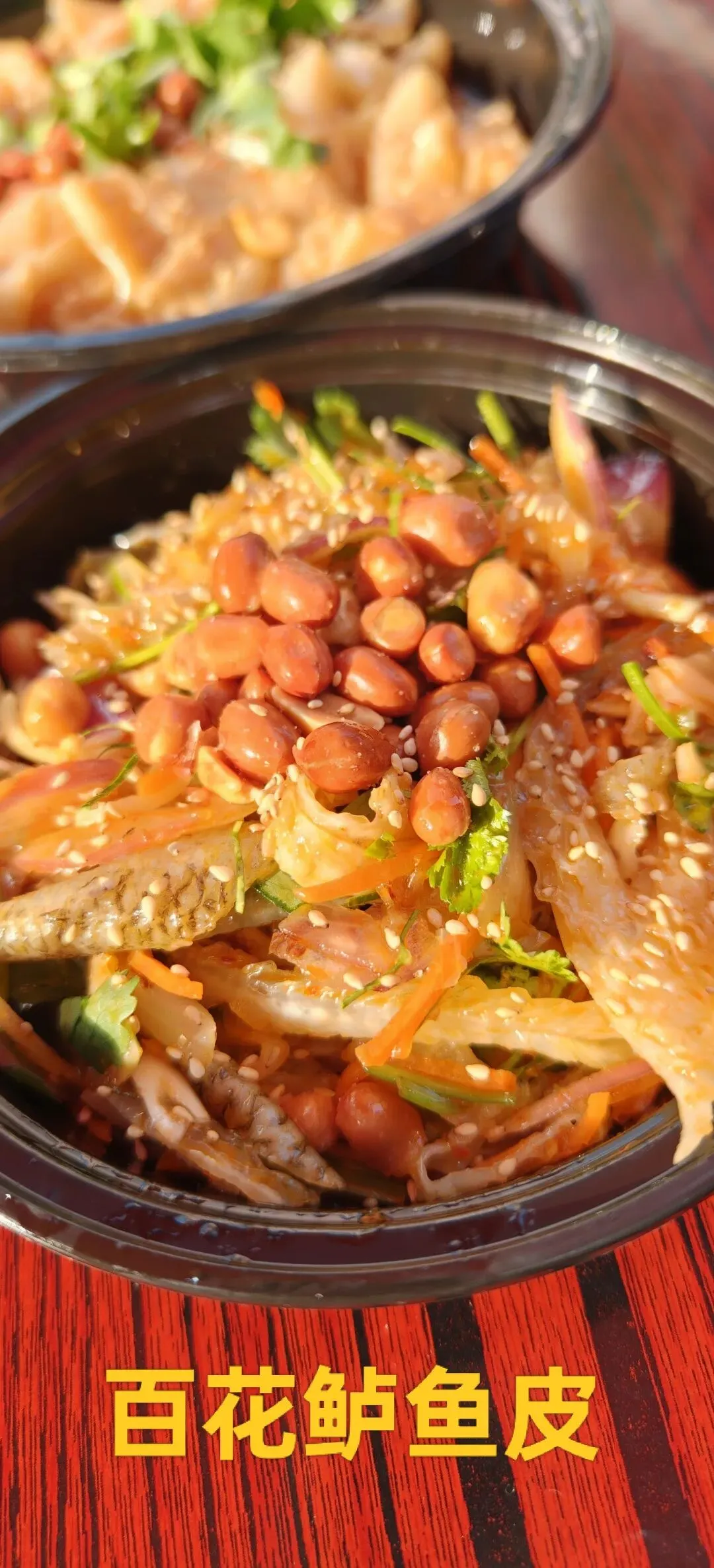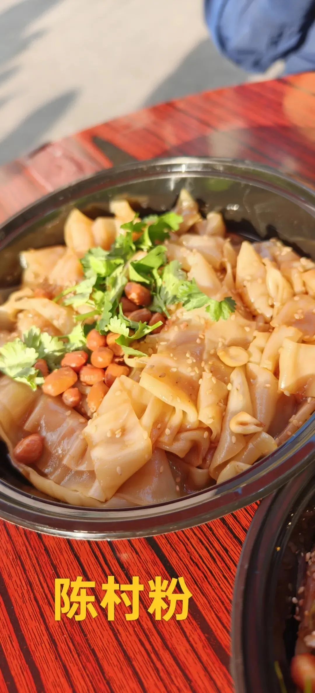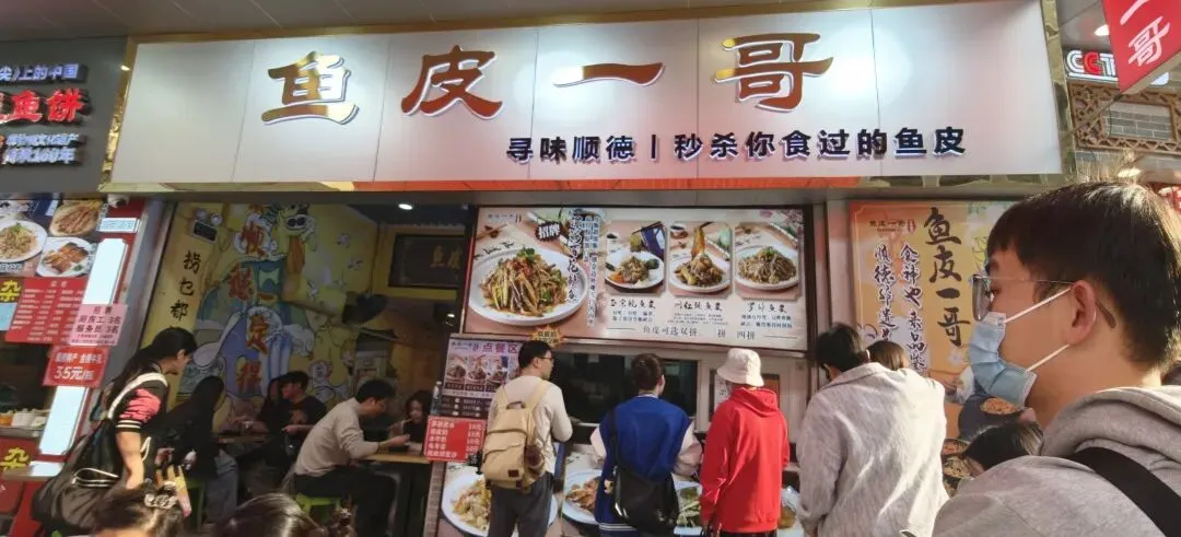 出店继续转,就看到很多顺德的美食,小红书推荐的一家店门口排起了队,其他店大多没什么人,我们在鱼皮一哥家点了陈村粉(口感和味道像宽面皮或者肠粉)和香辣味的鲈鱼皮,还不错。