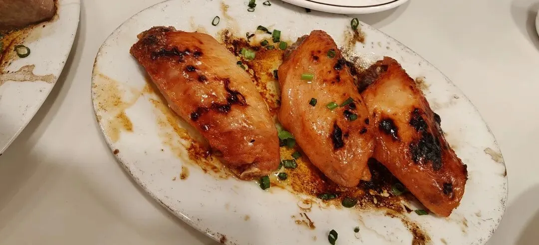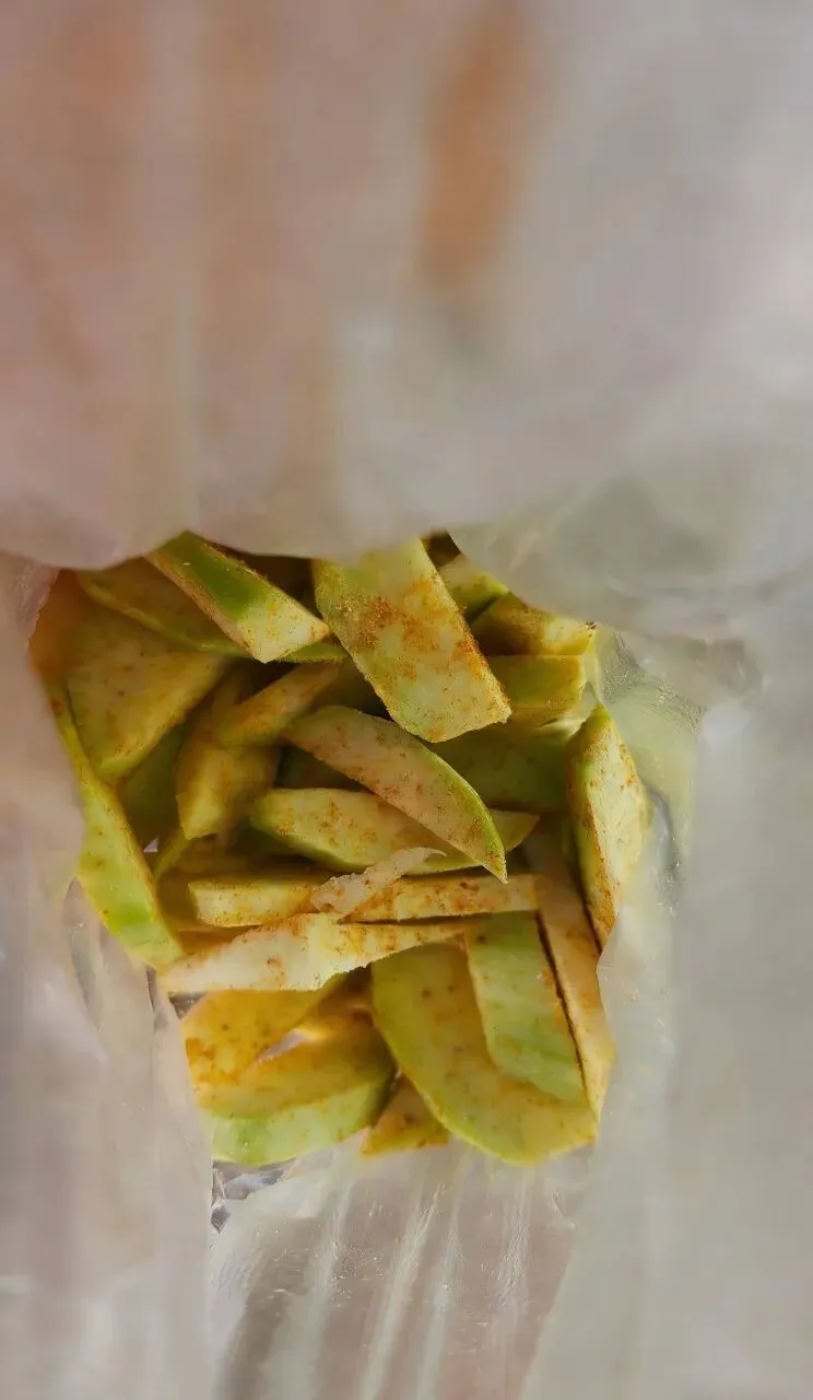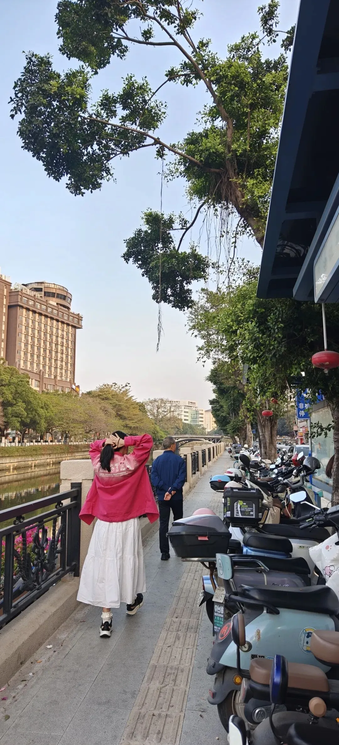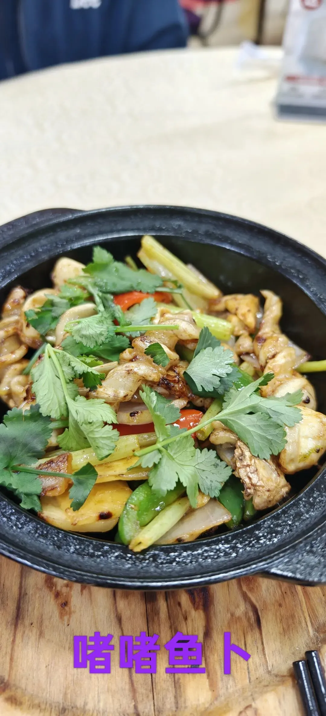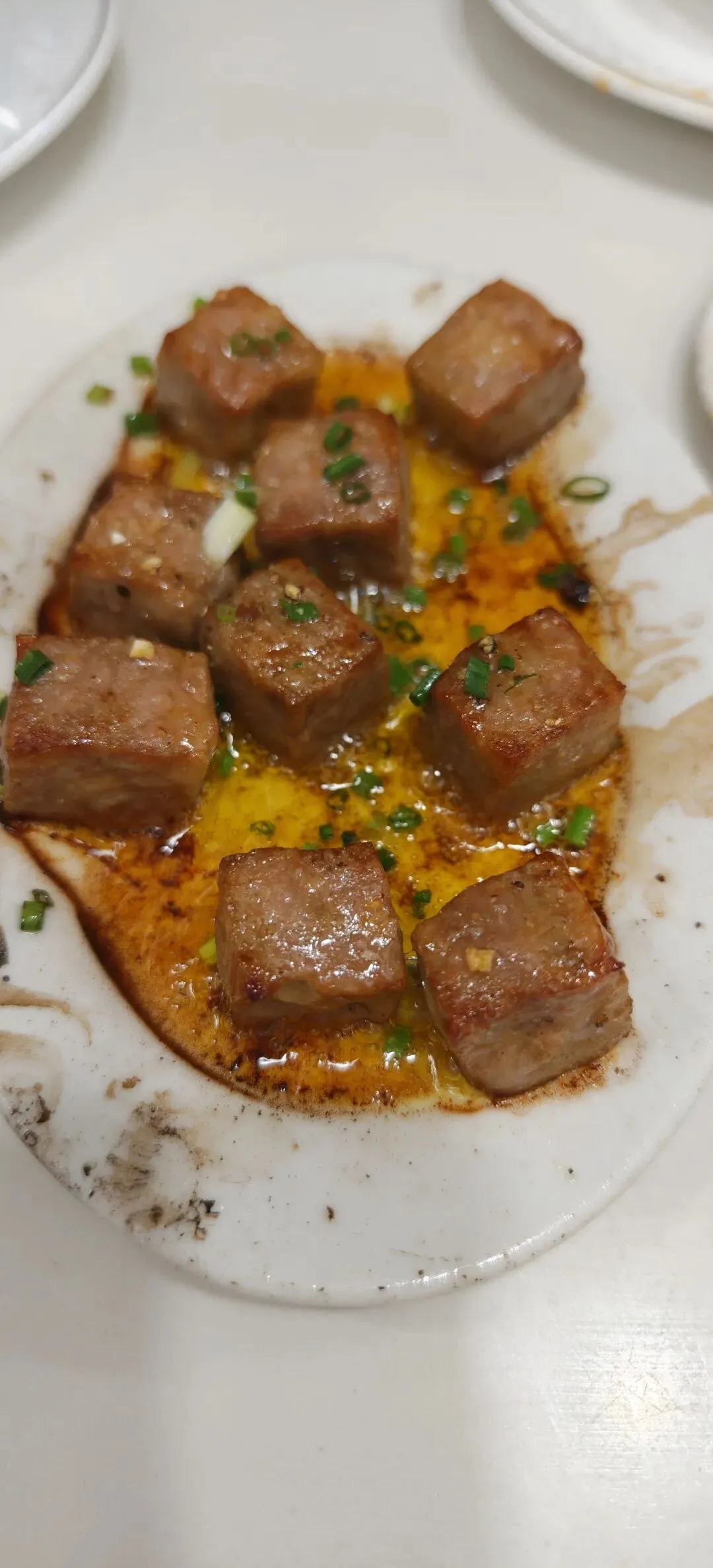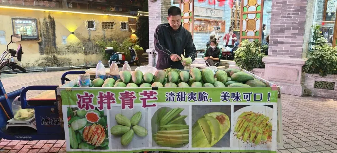 穿过广场看到一家卖双皮奶的,小祖宗又忍不住了,店家刚好做活动,同款第二件半价,好评后还送一份炸云吞。试吃了一下,味道很特别,老板介绍他家双皮奶很正宗,是真正的双层奶盖,也确实,奶盖有点脆脆的口感,味道纯正。炸云吞一般。 继续往前走穿过第一码头康宁桥对面的街道,小家伙又念叨吃水产品,也是,到了沿海城市还不吃点鱼呀啥的。又走了大概半站路,看到一家餐馆,人蛮多,点了一份名字奇怪的东西啫啫鱼卜,结果一问是鱼泡,味道是红烧味的,口感脆脆香香的,不错不错。 出了饭店走另外一条路过了桥,向着住处方向走,刘老师又说他今天又是一个没吃好的一天,哈哈哈。。。我们说,那你自己选吧,你说吃啥就吃啥。 结果又回到住处跟前那个十字的一家店,点了类似于烤肉但没串起来,盘子是店员夹过来的,好像是刚从烤架上拿下来的,店员正提醒烫,刘老师没听太懂,手还烫了一下。 吃完走到店门口,小祖宗还说想尝尝凉拌青芒,很好奇他到底是什么味道,做好了,一尝味道确实很奇特,是酸梅粉➕辣面,吃着脆脆的,酸酸甜甜辣辣,还蛮好吃,但青芒实在太大,根本吃不完。 回到汉庭酒店,下楼去取拖鞋,恰巧遇到送餐的机器人在电梯里,这还是第一次,本来想和它搭个讪,一想它万一没这功能,我岂不是显得很傻😅 逛吃逛吃逛吃的一天终于结束,我的肠胃也终于可以休息一下了。