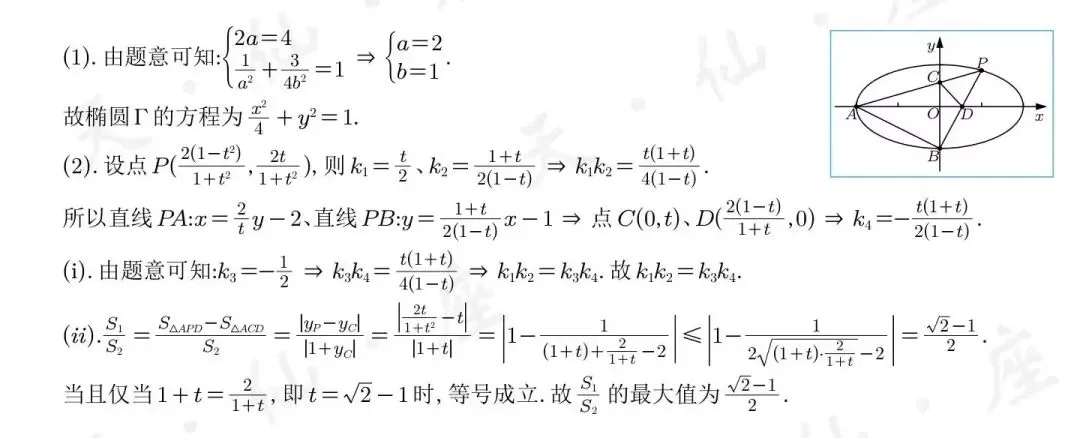 本题中规中矩,以前见过多次,也推导过相应的结论。由于直线PA、PB分别过椭圆Γ的两个顶点,则本题考虑使用有理参数法(三角代换法)设点较为简单,表达出对斜率形式较好。