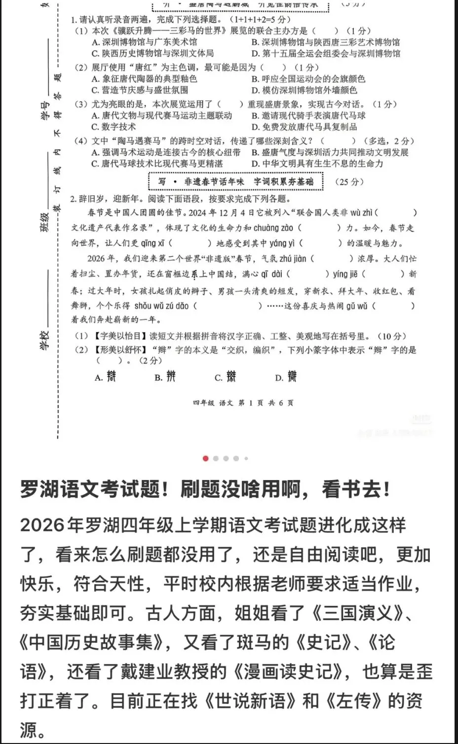 而深圳各区的期末试卷,正在颠覆这种惯性:南山区以APEC会议为主题的语文实践创作,宛如一位严谨的国际向导,带领孩子在真实语境中锤炼逻辑表达与价值判断;罗湖区融入传统文化的试题,恰似一位温润的文化使者,引导孩子在自由阅读中构建文化认知的殿堂;福田区的本土植物连线题,则像一位俏皮的城市向导,鼓励孩子走出书房,去触摸身边的城市肌理。