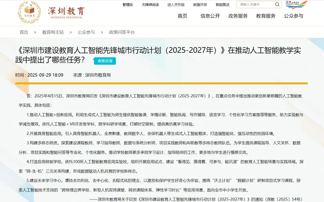 深圳作为“改革开放第一城”和“人工智能先锋城市”,在人工智能(AI)教育方面的推进力度在全国处于领先地位。深圳发布了《深圳市建设教育人工智能先锋城市行动计划(2025—2027年)》,在全市中小学推进人工智能教育,目标是到2027年,全市中小学实现人工智能教育的全员普及。