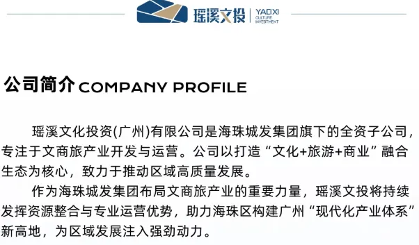 瑶溪文化投资(广州)有限公司是海珠城发集团旗下的全资子公司,专注于文商旅产业开发与运营。公司以打造“文化+旅游+商业”融合生态为核心,致力于推动区域高质量发展。