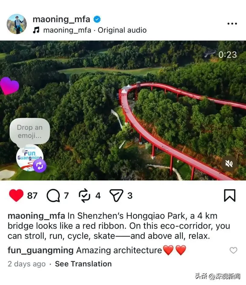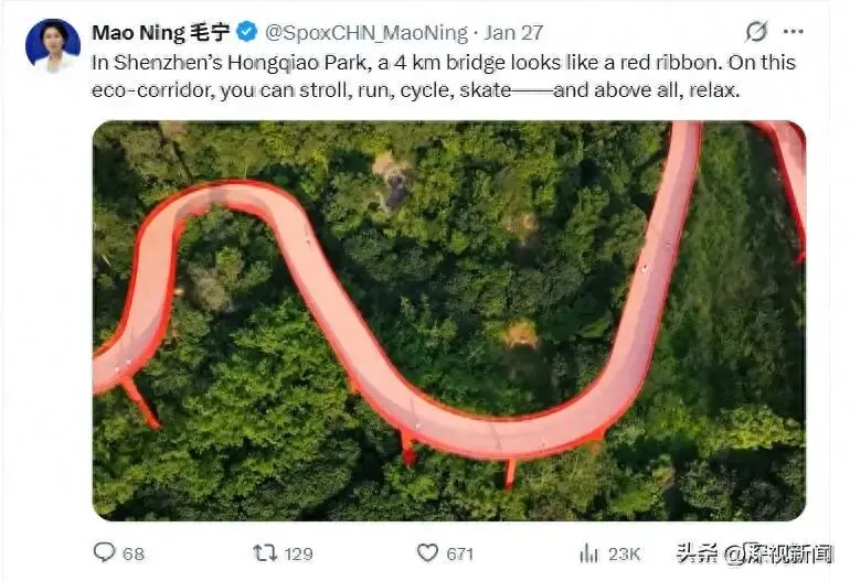 帖文中毛宁分享道:“在深圳虹桥公园,一座全长4公里的桥梁宛如一条红色丝带。在这条生态廊道上,你可以漫步、奔跑、骑行、轮滑,而最重要的,是在这里放松身心。”