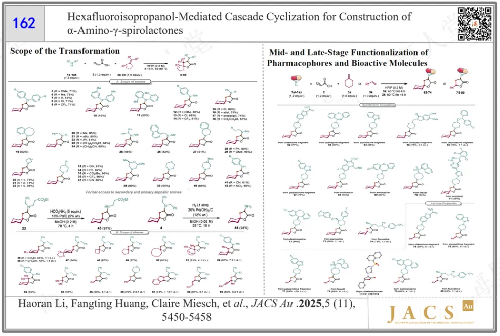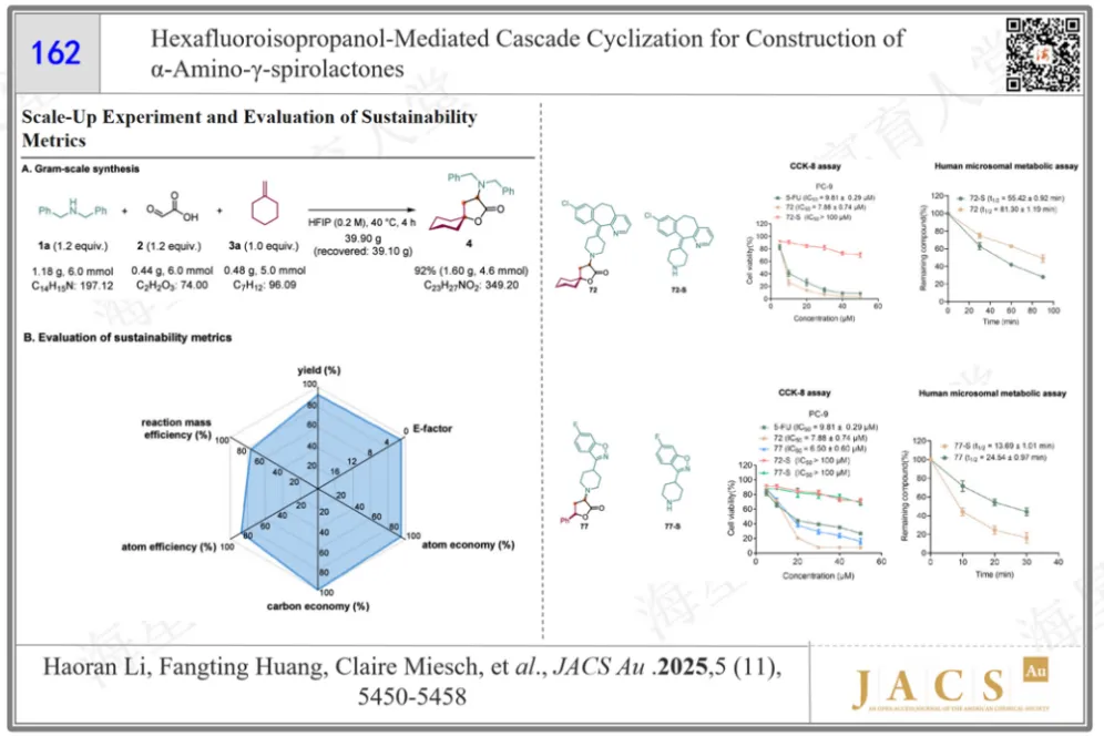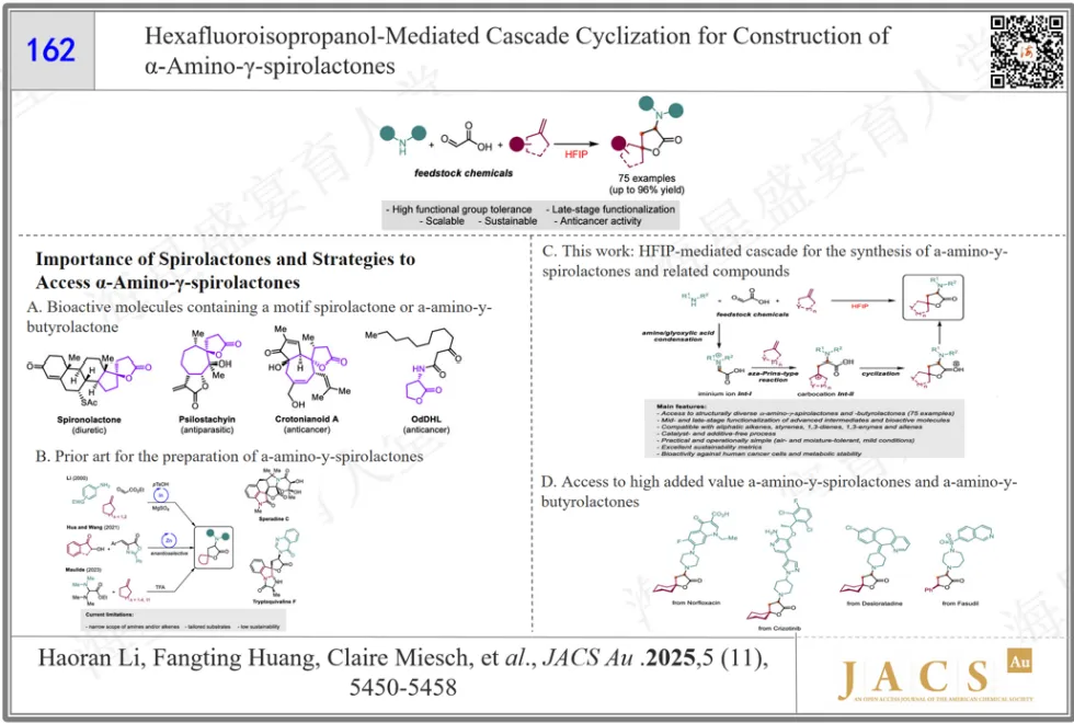 【结论】该研究开发了高效、通用的α-氨基-γ-螺内酯合成方法,通过HFIP介导的三组分级联反应,实现了从简单原料到复杂三维分子的快速构建;其优异的兼容性、可扩展性、可持续性及产物的潜在生物活性,为药物研发提供了重要工具,在新型治疗药物开发中具有广阔应用前景。