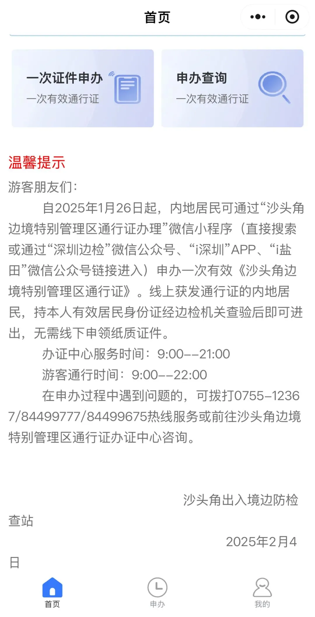 1、网上提前申请通行证,小程序『沙头角边境特别管理区通行证办理』