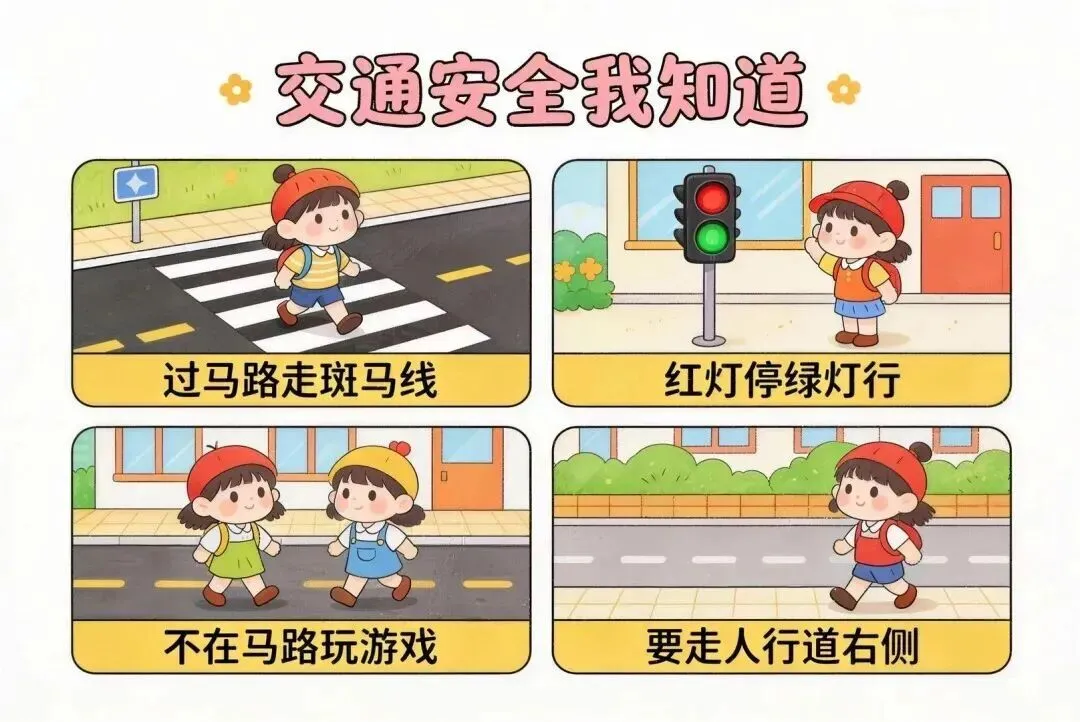 家长要以身示范,严格遵守交通规则,不驾乘无牌无证的车辆,并教育孩子出行时刻注意交通安全,过马路要走人行道,不闯红灯,注意左右观察,勿跨越交通护栏。不在机动车道内拦车、上下车,不要在路上追逐打闹或做其他妨碍交通的行为。