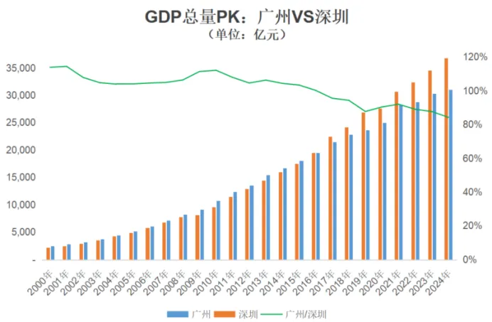 2024年广州GDP总量为31,032.50亿元,深圳达到36,801.87亿元,广州GDP仅为深圳的84.3%。而遥想世纪初的2000年,广州GDP还是深圳的1.14倍。