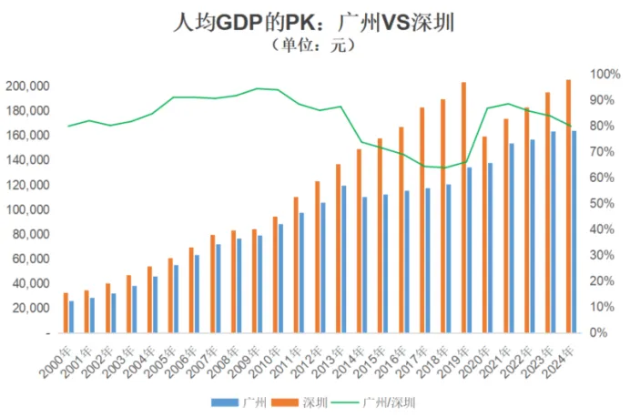 深圳于2011年人均GDP首次突破了10万元,达到11.04万元,2024年深圳人均GDP突破了20万元,达到20.57万元。广州于2012年时人均GDP才突破10万元,达到10.59万元,2024年广州人均GDP为16.42万元,仅为深圳的79.8%。