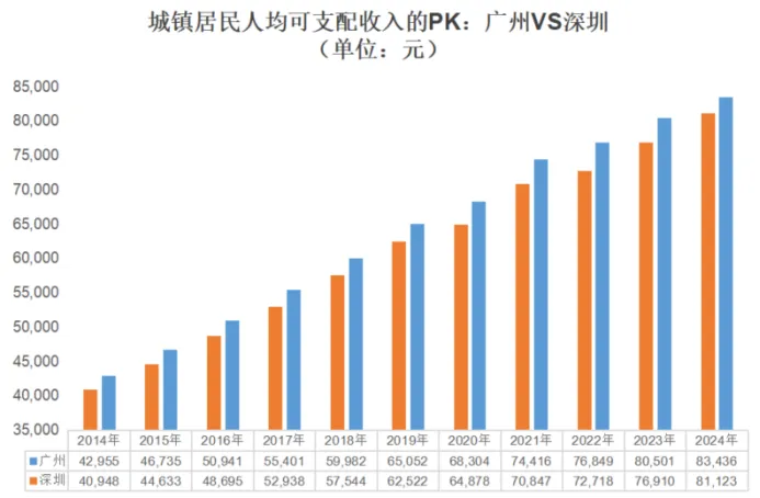 2024年广州城镇居民人均可支配收入为8.34万元,而深圳是8.11万元。