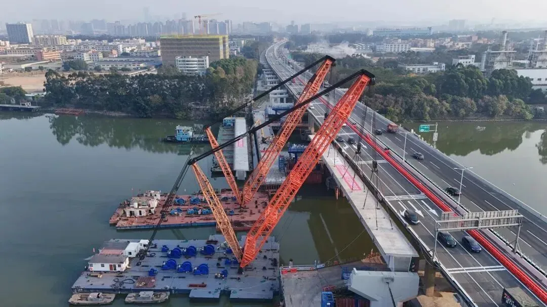 ● 日前,广深高速改扩建项目(穗莞段)道滘河大桥首片钢混组合梁安装完成。
