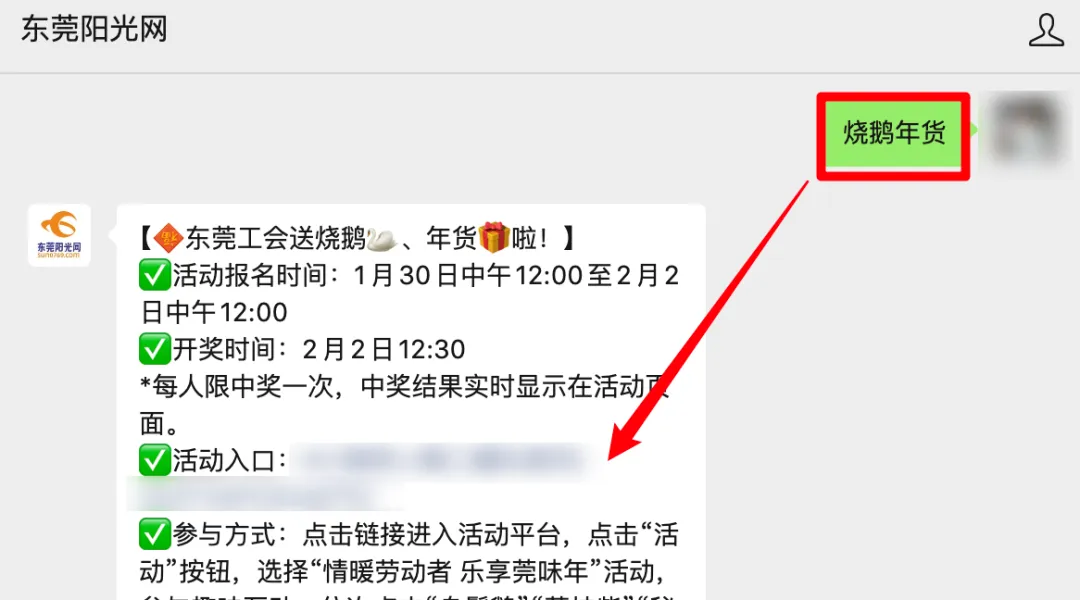 2.点击“私信”,对话框输入并发送关键词“烧鹅年货”,即可获取活动入口;
