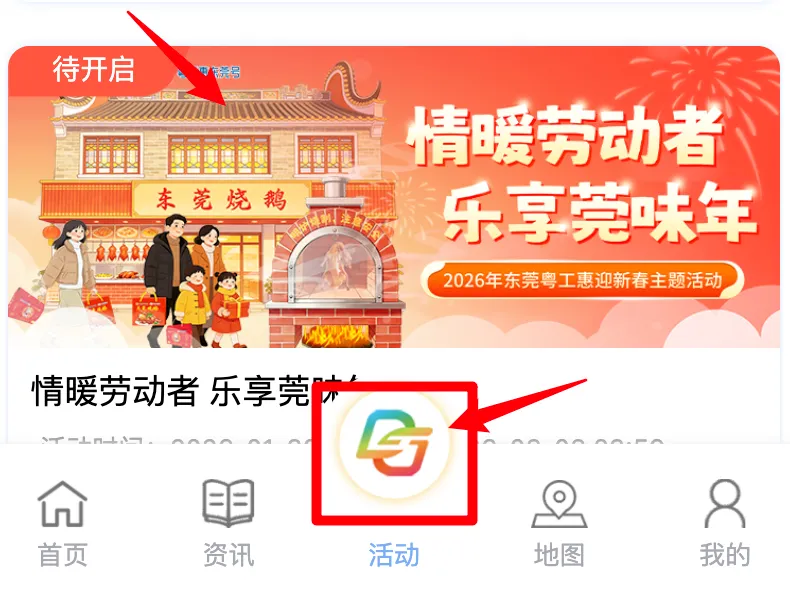 3.进入活动平台,点击“活动”按钮,选择“情暖劳动者 乐享莞味年”活动,参与趣味互动即可获取抽奖机会。