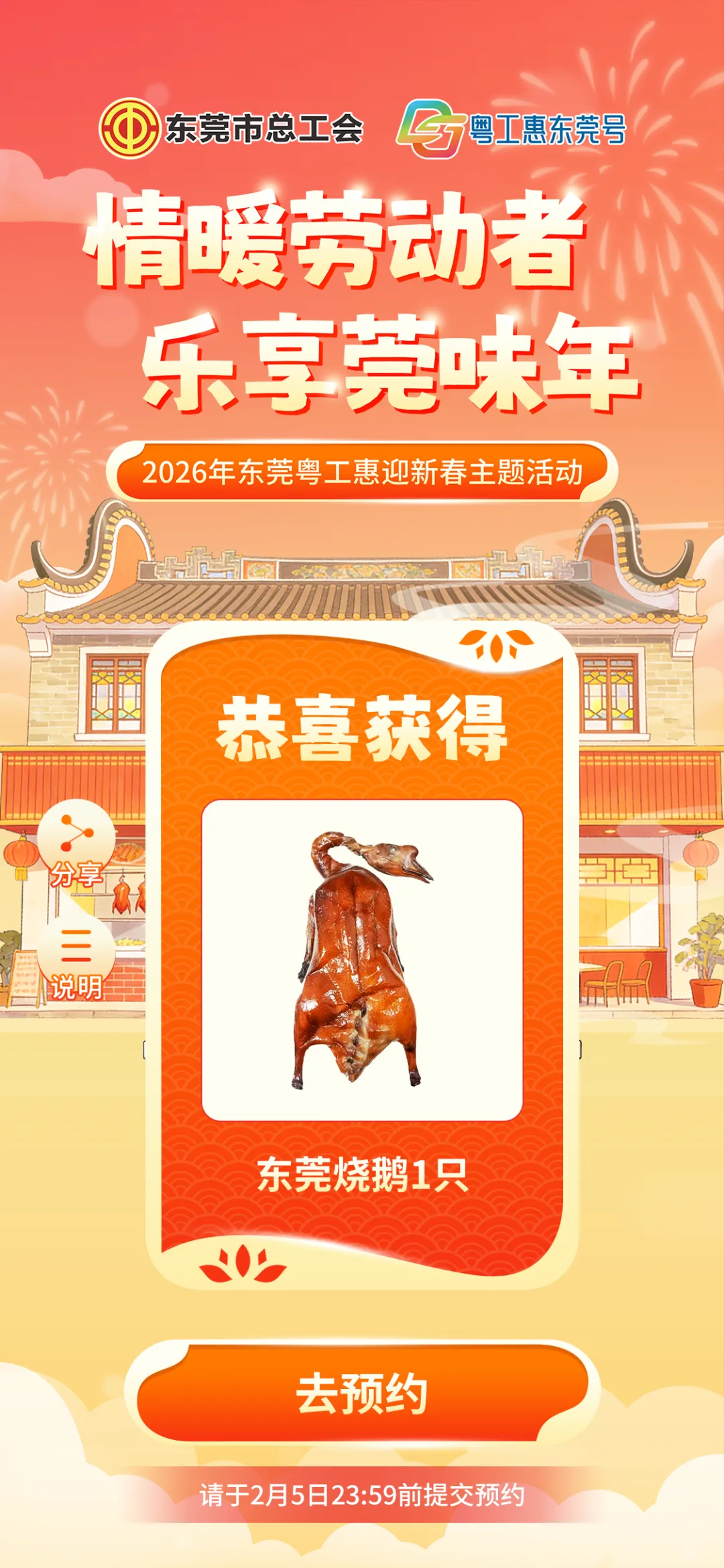 本次新春福利共设两类奖品,分别是“东莞烧鹅”1只和“东莞年货”礼盒1份。其中: