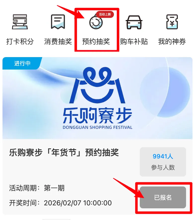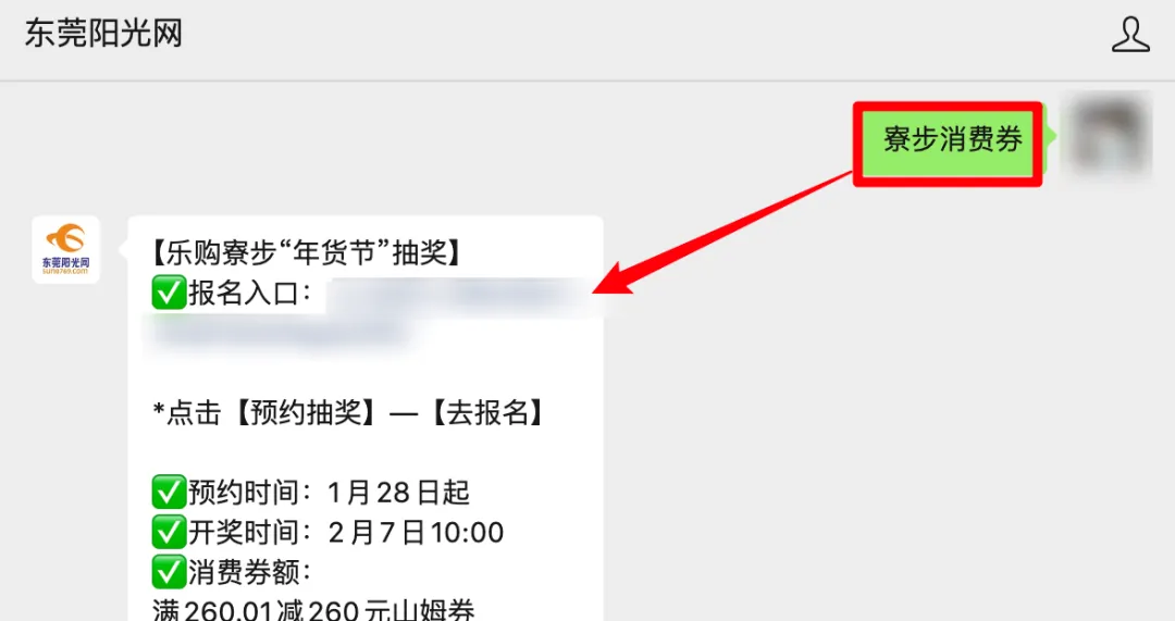 2.点击“私信”,对话框输入并发送关键词“寮步消费券”,点击链接进入活动平台,点击“预约抽奖”—“去报名”。
