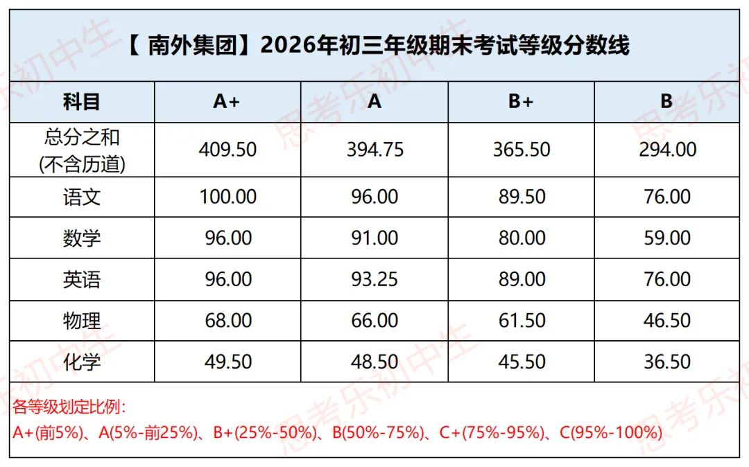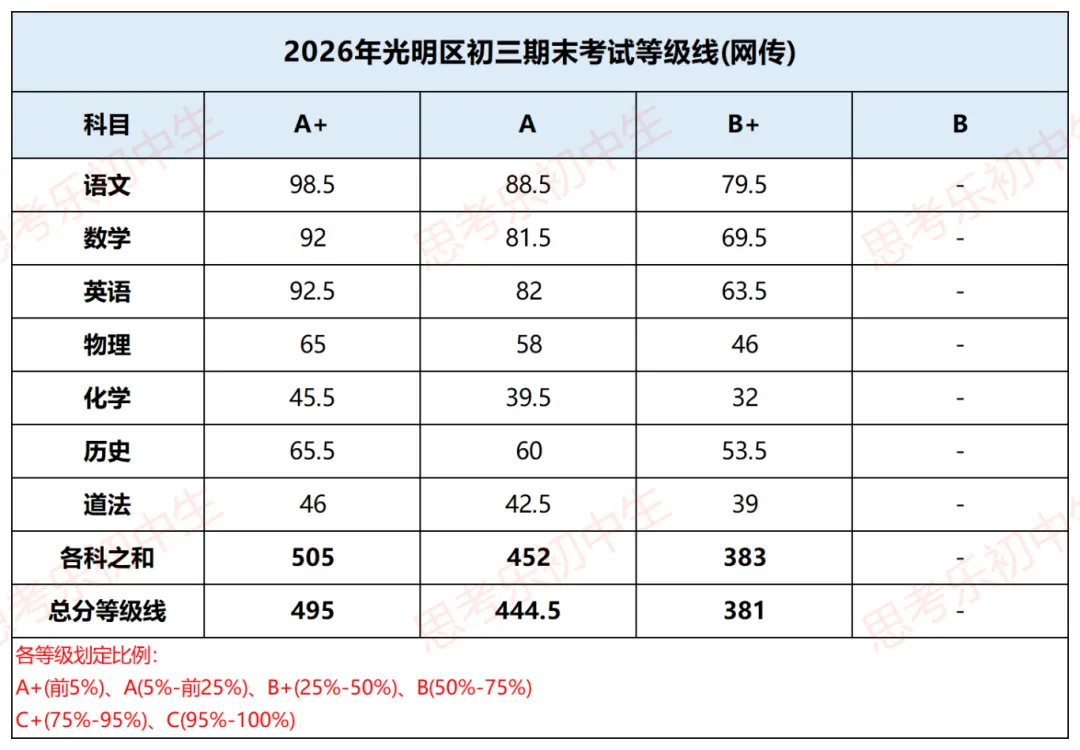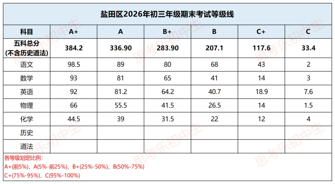 更新!深圳七区/校2025-2026学年初三上期末考试等级线