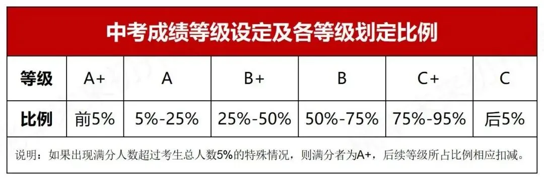 如果出现满分人数超过考生总人数5%的特殊情况,则满分者均为A+,后续等级所占比例相应扣减。