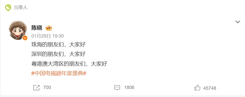 1月29日,在珠海参加活动的陈晓,向台下打招呼时口误“深圳的朋友”!在台上,嘴瓢的他,当时就把自己说愣住了。