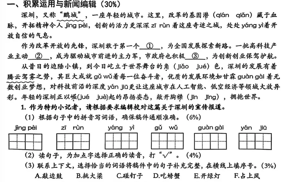 这在我们以前的试卷中,就是“读拼音、写汉字”和“选择正确的读音”。为什么要搞这么复杂?在自媒体作者们的眼里就是“卷”的问题了。其实这也是很多人不了解具体教学现场的情况。在过去的试卷中,我们往往会出现“同音异形字”的情况,单纯的读读拼音写汉字,容易出现问题。新课程标准同时为了解决这样的问题,也为了解决“学语文有什么用”的问题,希望语言文字在具体的语境中运用,结合语境来辨别到底用什么语词。那么,从这个角度来说,这样的考评方式的目的就非常明晰了,并不是为了“卷”,为了增加孩子阅读障碍的行为了。反过来看,过去的试卷虽然要求直接、简单,但是仅仅是“为了考而考,并不是运用”。同时,如果我们的眼界更远一点的话,就会发现,全国多个地方的试卷都是这种趋势,所以这样的做法并不是深圳所独有,也不是深圳为了“卷”而“卷”的做法。