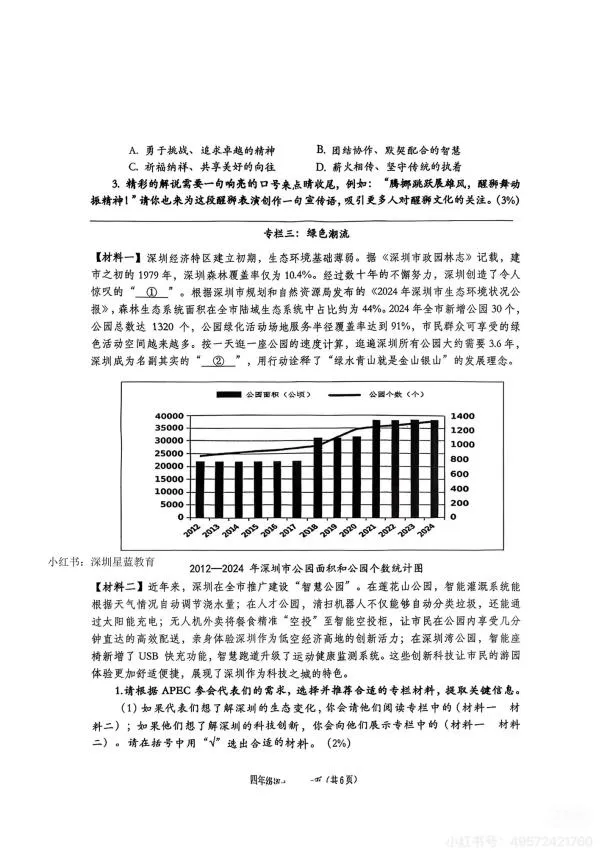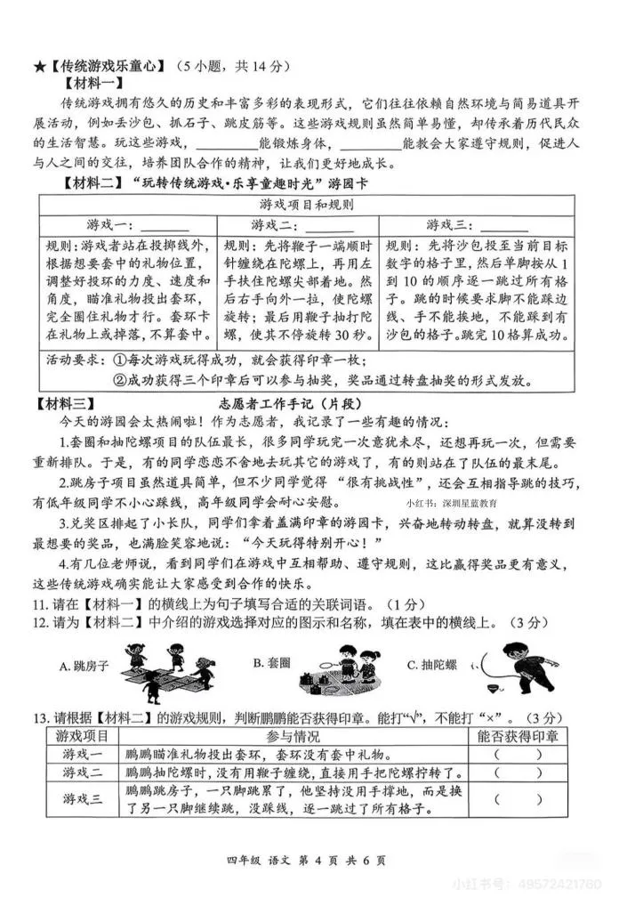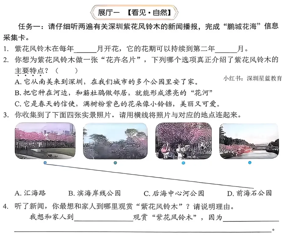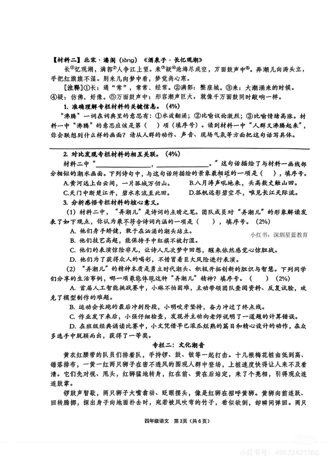 很多自媒体的作者关注的第二点就是这些试卷都在关注深圳,关注岭南文化,关注身边的生活,并以此作为试卷串联各个考评项目的线索。就四年级而言,我们依次可以看到: