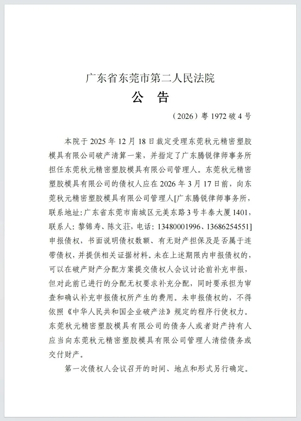 广东省东莞市第二人民法院于2025年12月18日依法裁定受理东莞秋元精密塑胶模具有限公司破产清算一案,于2026年1月16日指定广东腾锐律师事务所担任东莞秋元精密塑胶模具有限公司管理人,由管理人接受各债权人申报债权。债权人向管理人申报债权时,应按下列要求提交申报材料: