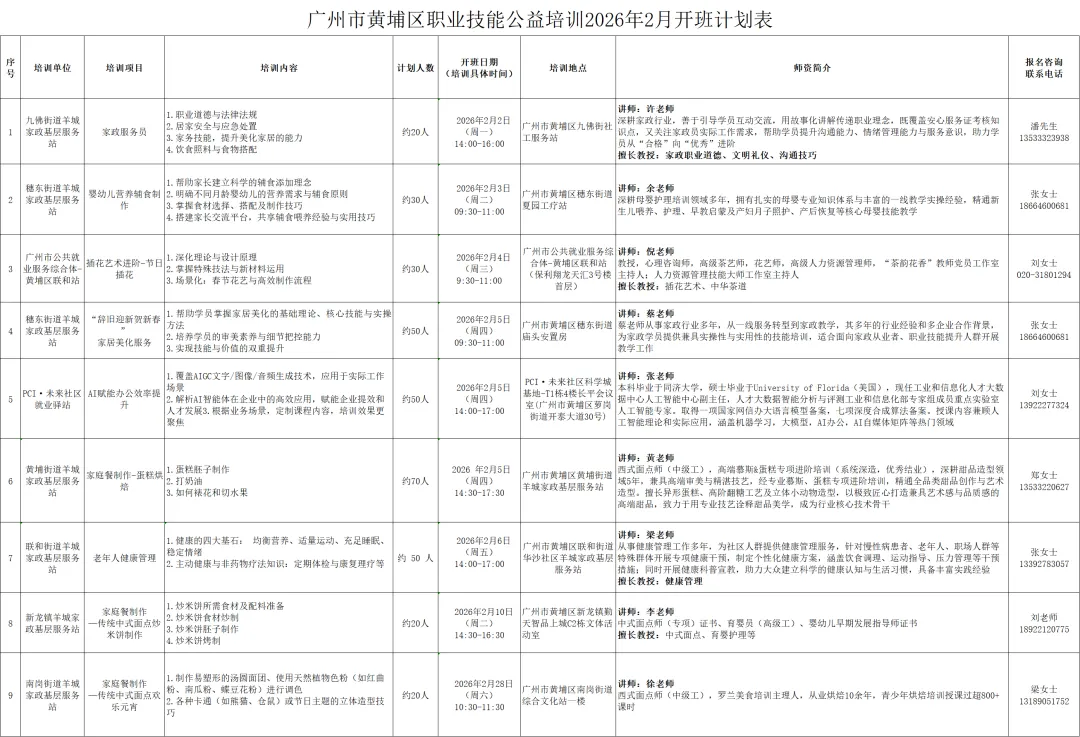广州市黄埔区职业技能公益培训2026年2月开班计划表如下,