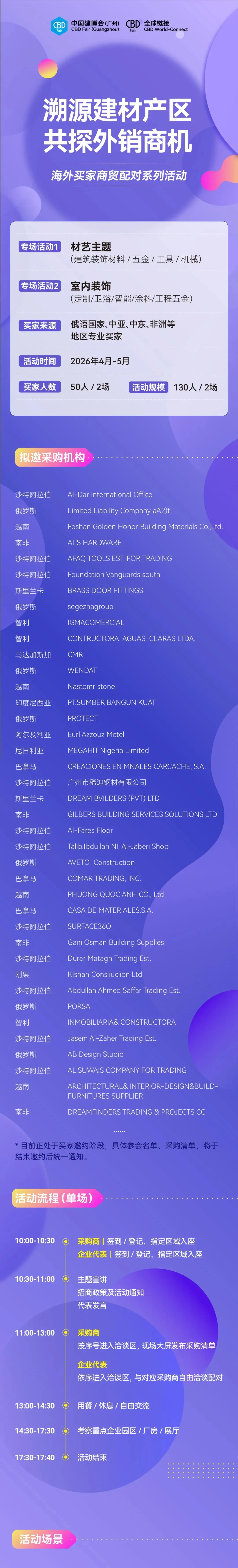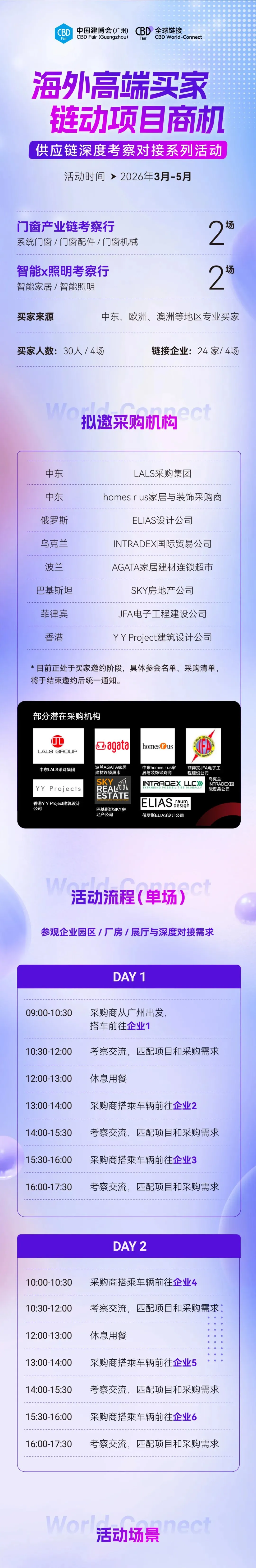 中国建装企业出海从“走出去”参展,将迈向“精准链接”与“深度信任”构建。广州建博会2026年度“商贸对接活动”将展会的高效场景前置,在展前数月即为海外实力买家与国内优质展商搭建零距离、高信任的深度洽谈平台,化“广泛接触”为“精准匹配”,变“产品展示”为“深度考察”,帮助企业提前锁定订单,让参展价值最大化。