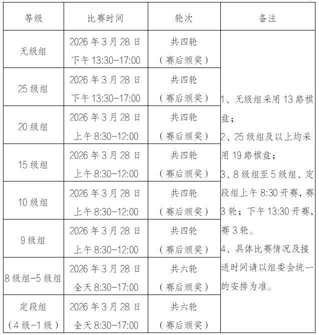 注:无级组采用13路棋盘,其他组别均采用19路棋盘。以上按实际参赛人数计算百分比,小数点后按四舍五入计算。“实际参赛人数”为比赛轮次数大于或等于3轮的选手人数(例如:100人报名只有90人完成3轮比赛的,则按90人计算百分比)。定段升段赛:为了鼓励女子选手参赛,定段组未定段的女子选手第一名且胜率达到50%(含50%)的可定段。