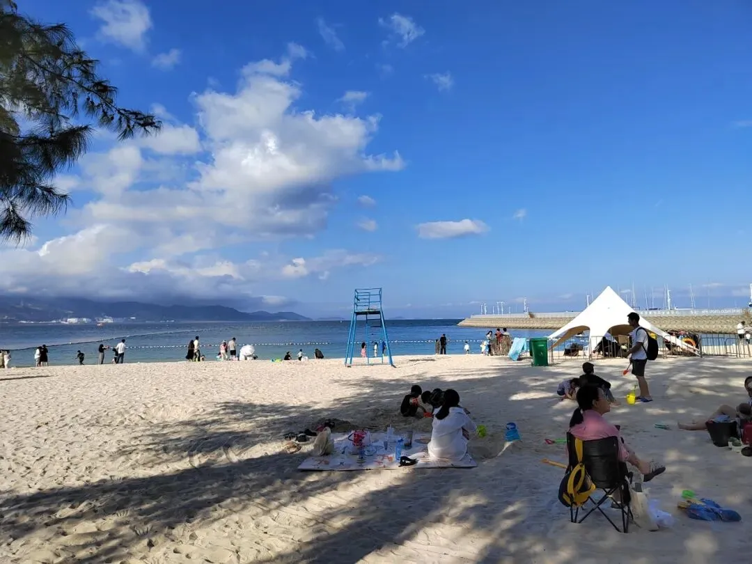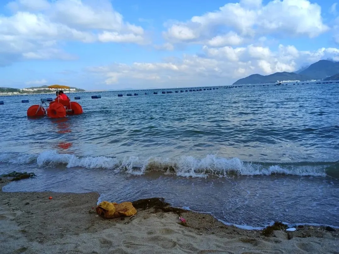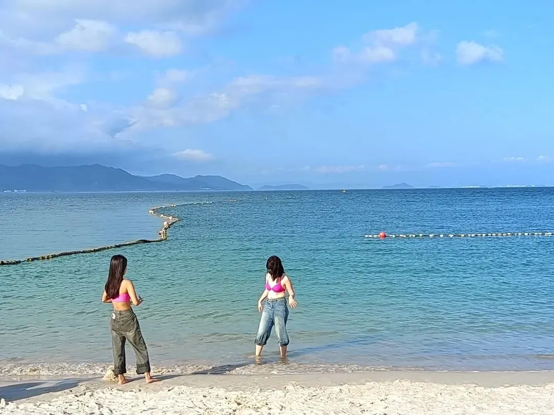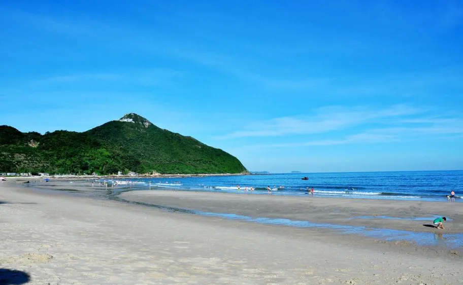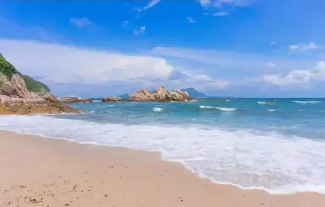 这里的海水给人一种深幽的感觉,旁边的山则是云雾缭绕,害羞的露出半边脸,幽谧的蓝色海精灵和灵雅而起伏的青山相环绕。沙滩洁静,树影婆娑,海风轻柔,三面青山环抱,一面海天一色,明媚的阳光,蔚蓝的海水,洁白的沙滩和醉人的海风,这里的沙质也特别好,很细!(注:暂不收门票,后续如需门票费用自理)