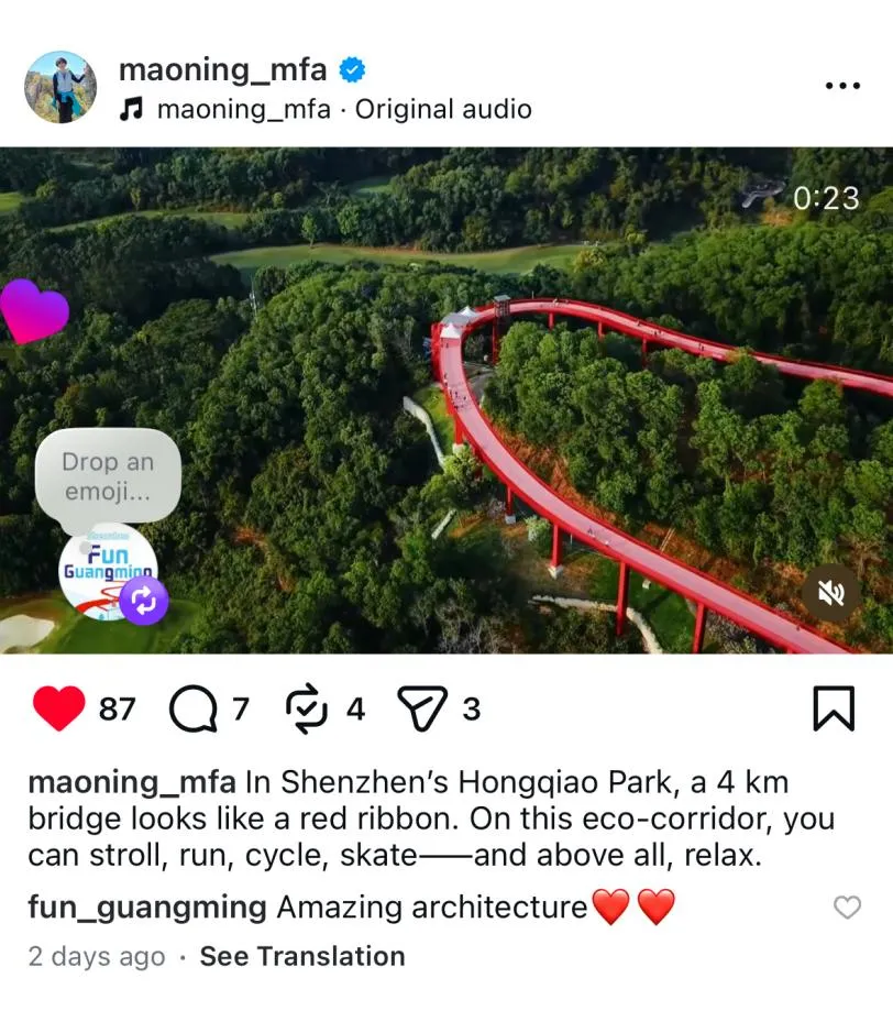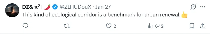 帖子发出后,在海外平台收获了上万播放量、数百个点赞和转发。网友在评论区留言道:“Wow!”“真想去中国!”“这种生态廊道,是城市更新的模范。”