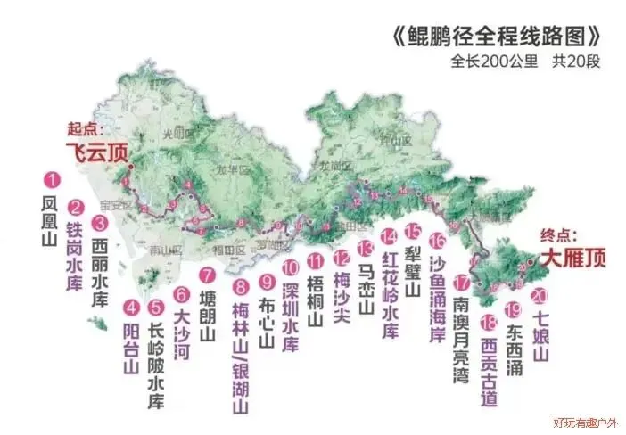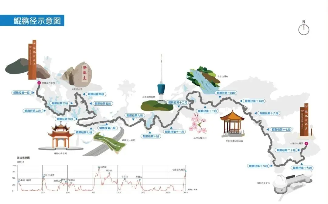 鲲鹏径作为深圳最长的远足径路线,西起凤凰山飞云顶,东至七娘山(《新安县志》旧称“大鹏山”)大雁顶,全长约200公里,全程分为20段,穿越山岭、森林、湖泊、溪涧、海岸。
