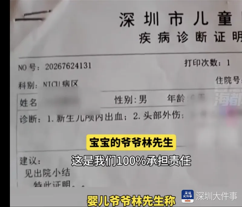 事发后,孩子被紧急送往深圳市儿童医院救治,经检查确诊为颅内出血,随即转入ICU接受治疗。“出事时孩子才出生6天,他妈妈和奶奶心都碎了。”林先生语气沉重地说。