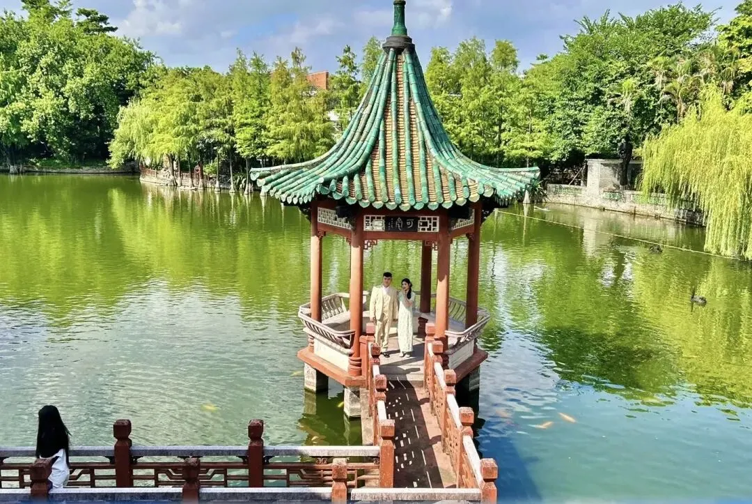 最后,请大家随我穿过一道精巧的垅门,来到可园的后园。眼前豁然开朗,一池碧水,倒映着天光云影与周围的亭台楼阁。池边的凉亭,翼然临于水上,这里是与前部建筑密集区不同的开阔空间。 这方池塘与凉亭,是整个园林节奏的完美收束。如果说前面的厅堂楼阁是生活的“聚”,是艺术的“凝”,那么这里便是心灵的“散”,是思绪的“逸”。主人可以在此垂钓、赏荷、纳凉、静思,或与三两知己凭栏远眺,享受“清风明月本无价,近水远山皆有情”的闲适。它体现了中国园林“可望、可行、可游、可居” 的终极理想,也为我们的游览画上了一个宁静而悠远的句号。