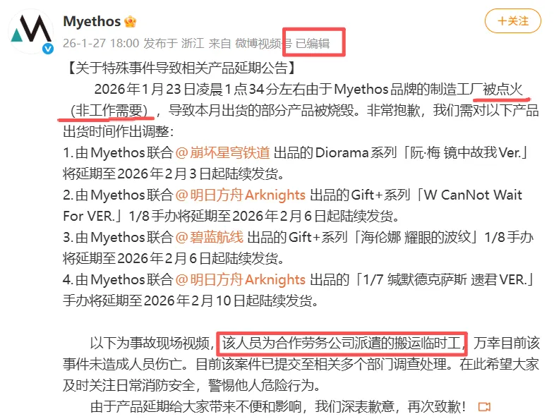 手办品牌方Myethos的公告内容也已修改,由原本“制造工厂被故意纵火”,修订为“制造工厂被点火(非工作需要)”。|来源:东莞+、Myethos。|东莞潮事儿编辑整理,如有侵权请联系。|商务合作:莫先生 15812898569