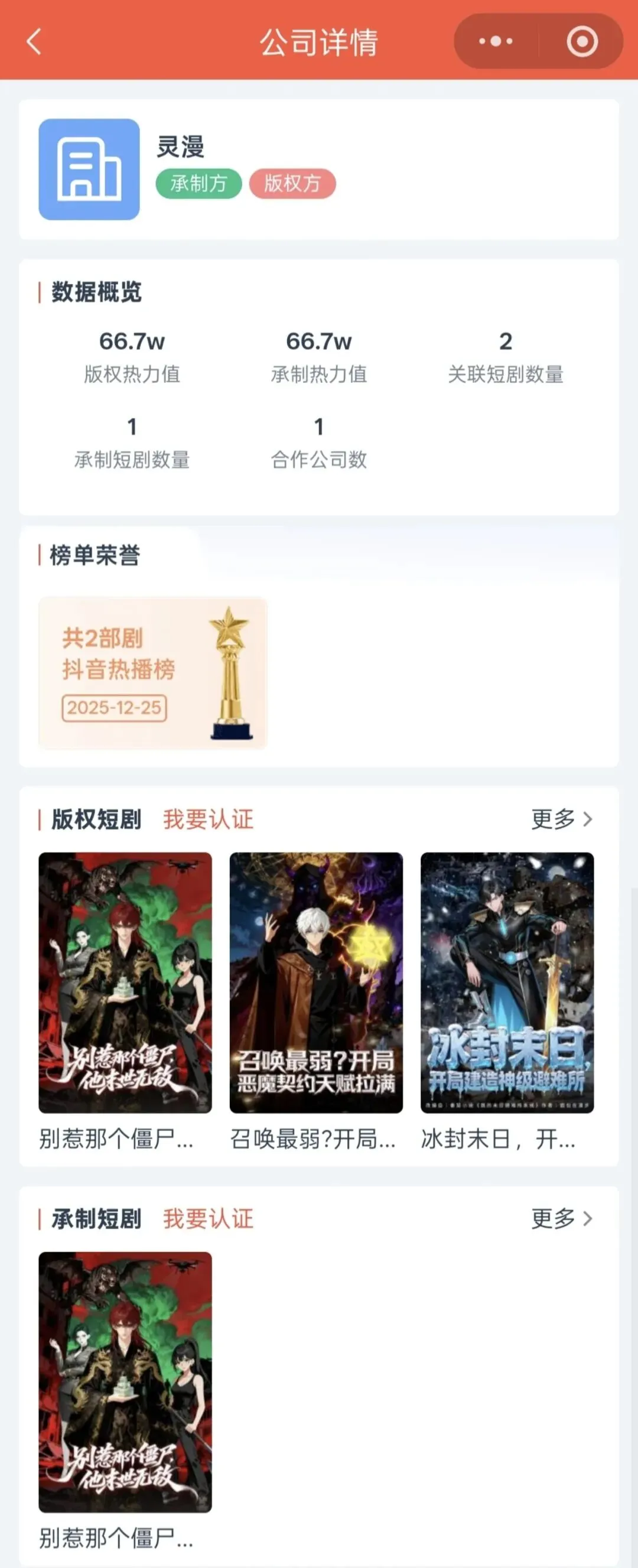 剧查查数据显示,灵漫快创专注于用AI技术重构漫剧生产流程,深度联动头部发行与网文IP平台,已打造全网1.5亿播放的现象级爆款漫剧《别惹那个僵尸,他末世无敌》、《召唤最弱?开局恶魔契约天赋拉满》等多部爆款。