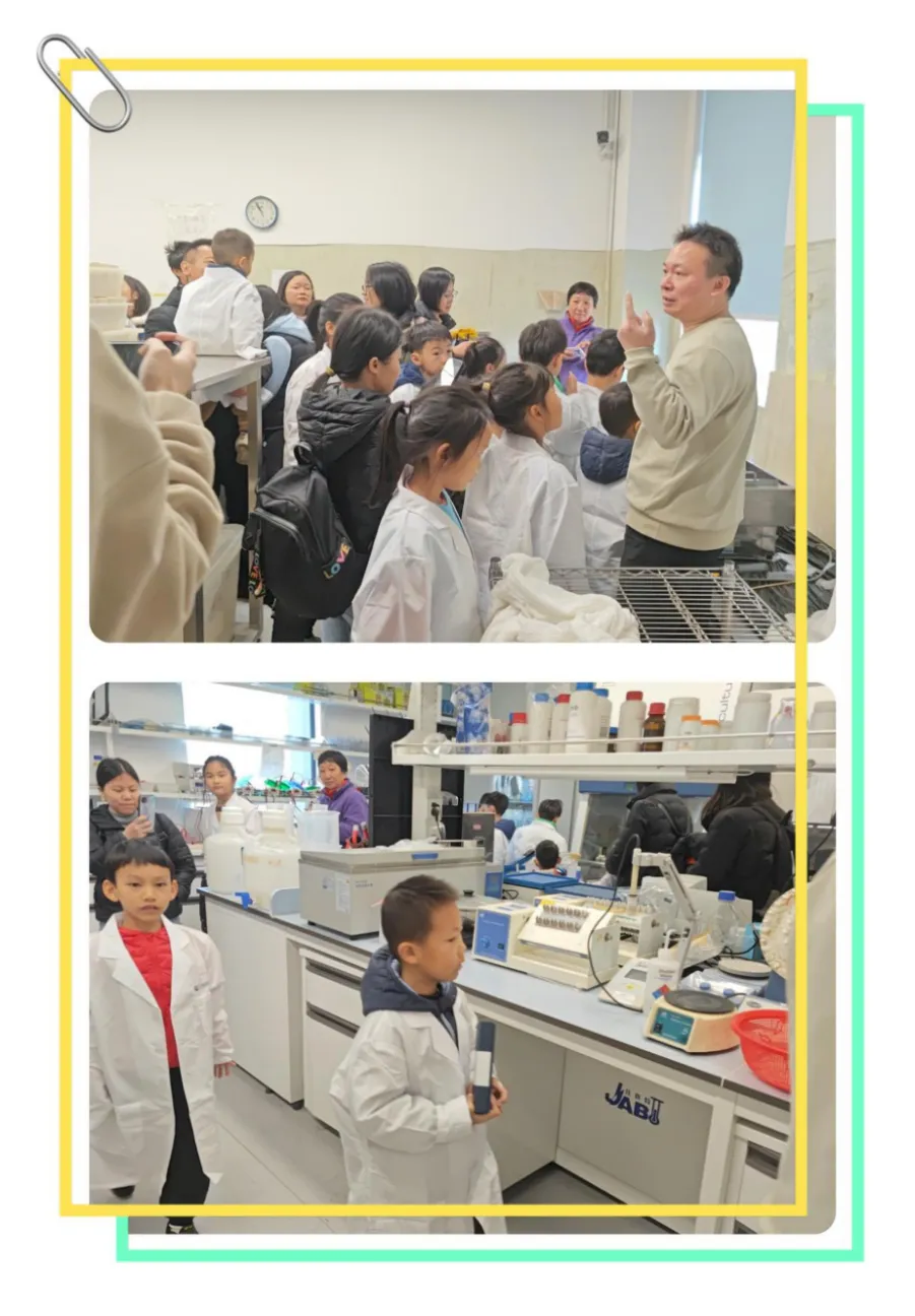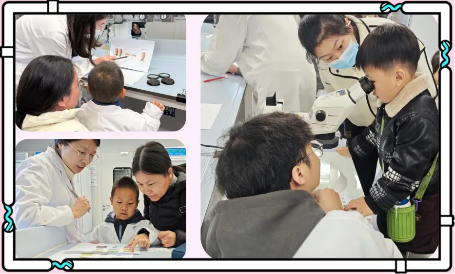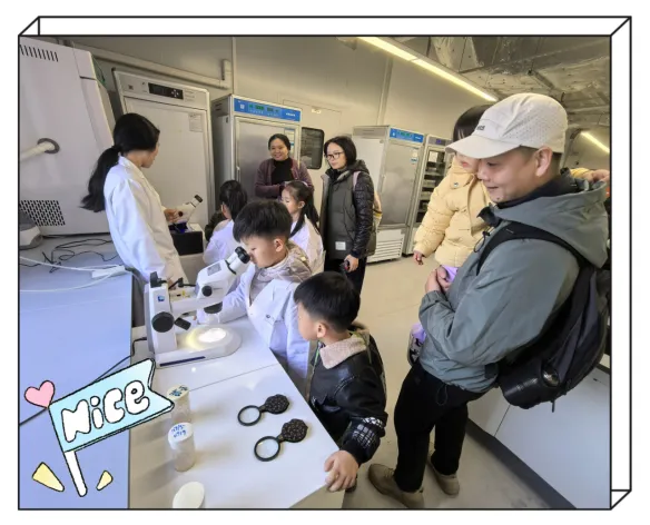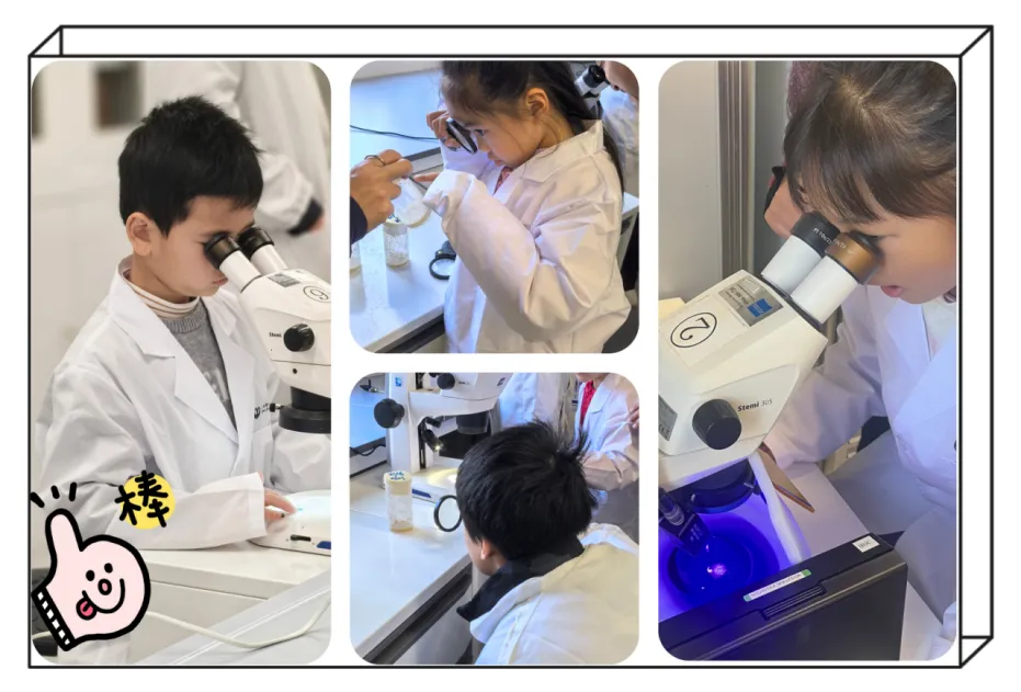 看着成千上万整齐排列的果蝇培养管、专门调配的“果蝇营养套餐”,还有精密的实验仪器,小朋友们眼睛瞪得溜圆,小声讨论“这里应该住着几万只果蝇吧?”“原来科学家们就是在这里研究它们呀”。实地探访让抽象的“科研”变得触手可及,大家对接下来的零距离互动更期待了。PART 3 零距离探索:显微镜下的“果蝇奇妙世界”!