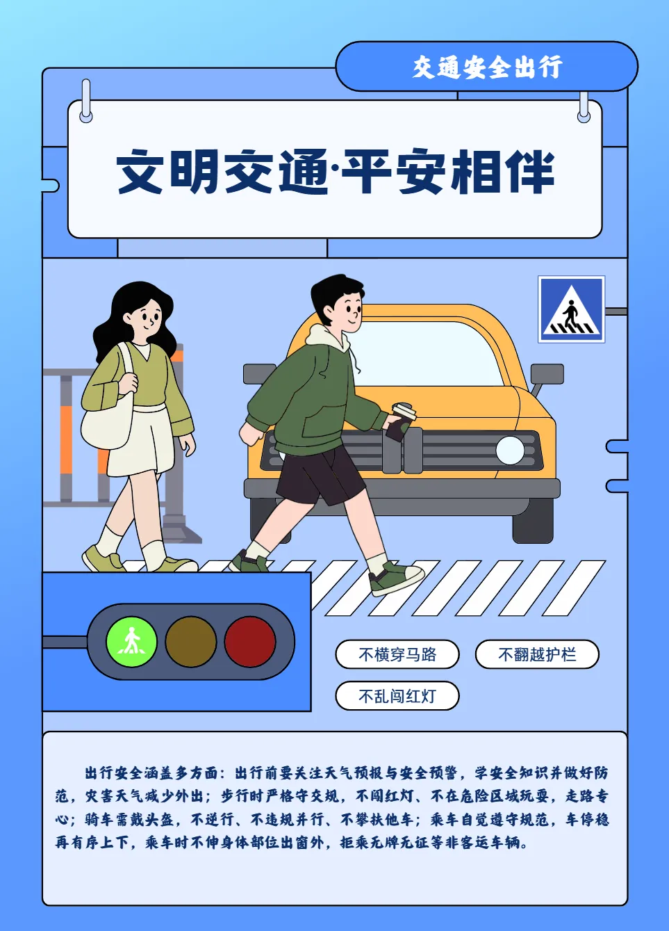 2.步行安全:外出时要严格遵守交通法规,不闯红灯、不翻越隔离栏、不在马路边或者车辆盲区内玩耍打闹;行走时要专心,注意周围情况,不要边走边玩手机或做其他事情。