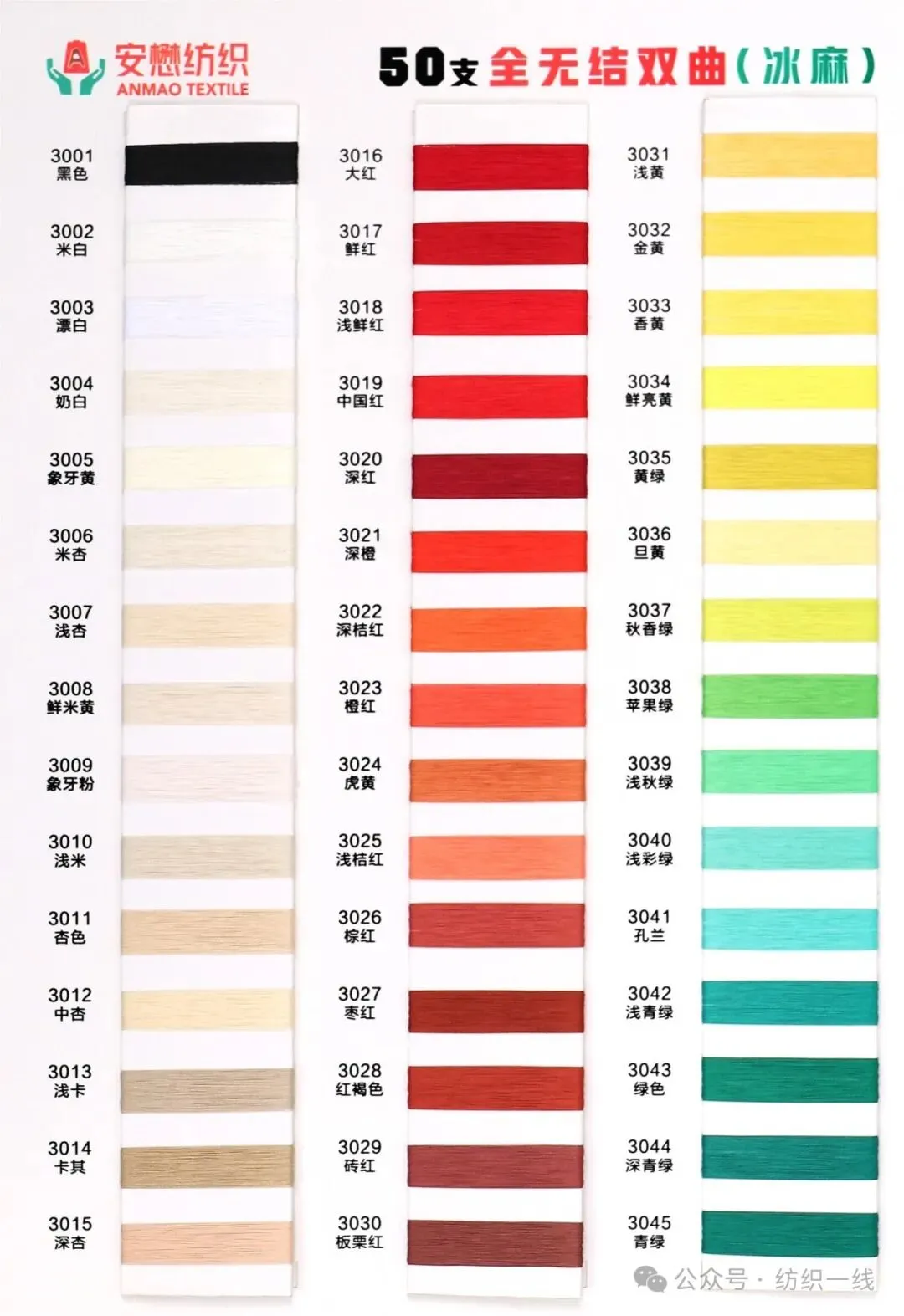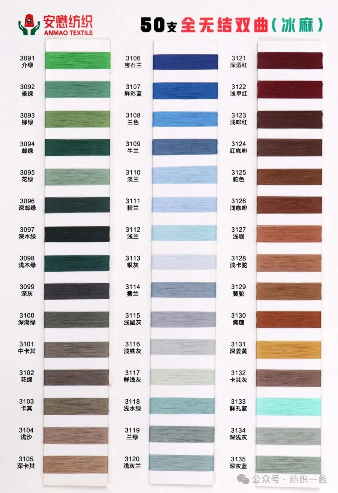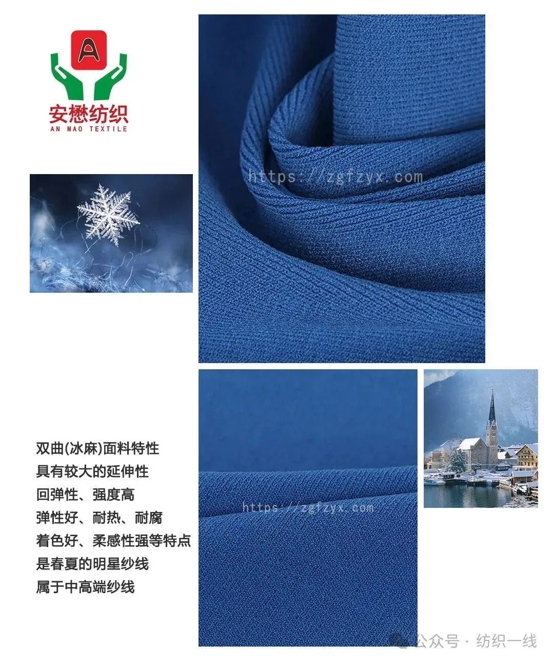 专业双曲(冰麻)无结头高品质纱线品种有,无光双曲(冰麻)有光双曲(冰麻)规格有,1/16支 1/18支 1/20支 1/24支 1/28支 1/30支 1/32支 1/35支 1/37支 1/39支 1/47支 1/50支 1/55支 1/65支 1/75支 1/86支.品种,规格 支数齐全,抗起球达标,色牢度达标,平整顺滑,质地高雅,弹力效果具一格,安懋公司是纱线行业的一支标杆。