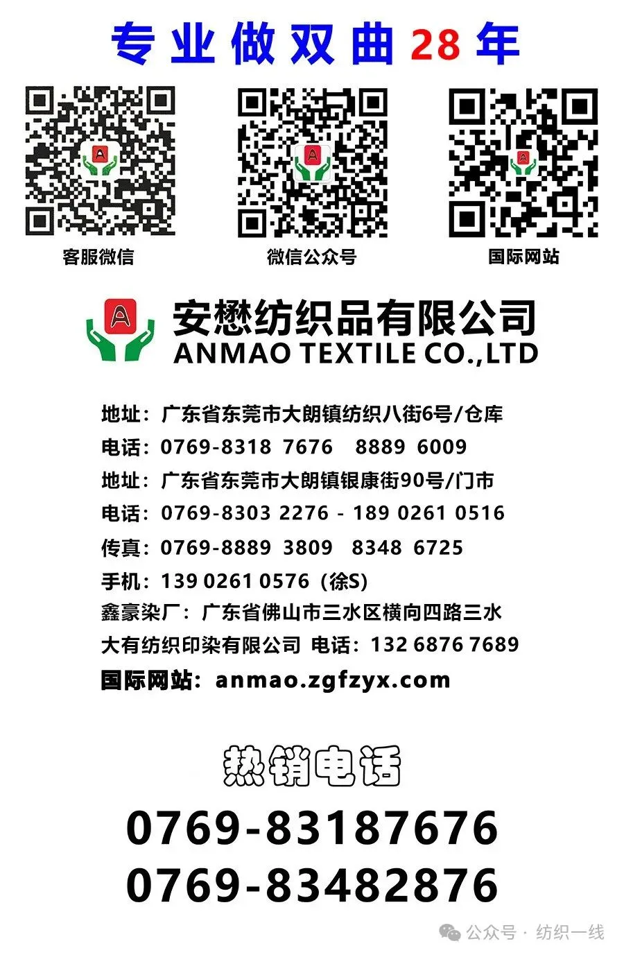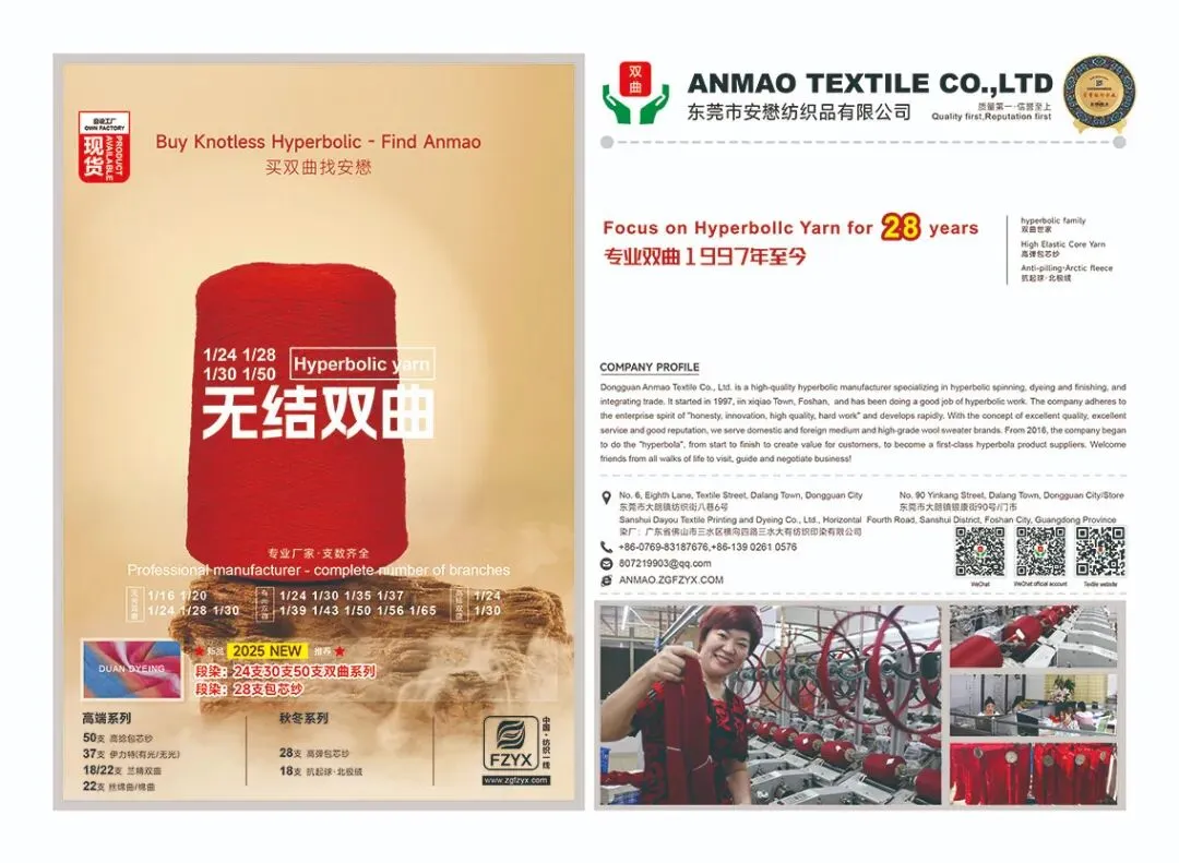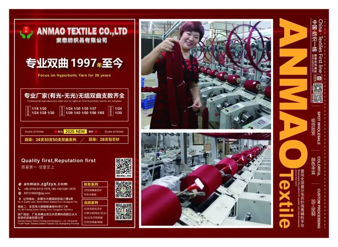 东莞市安懋纺织有限公司是一家专业做双曲.纺纱厂.染整.整合贸易为一体的优质双曲制造商,公司建立与1997年在佛山市西樵镇.佛山安鹏捻丝厂,致力于始终如一,做好优质双曲(冰麻)无结头纱线,是一集研发,生产,染整,产业链仓储式销售于一体的毛织纱线制造商。我们以优良的品质,服务,信誉为理念,服务于国内外中高端服装毛衫品牌,2016年开始做无结头双曲,从头到尾的无结双曲,为客户创造价值,做一流的春夏双曲纱线供应商。