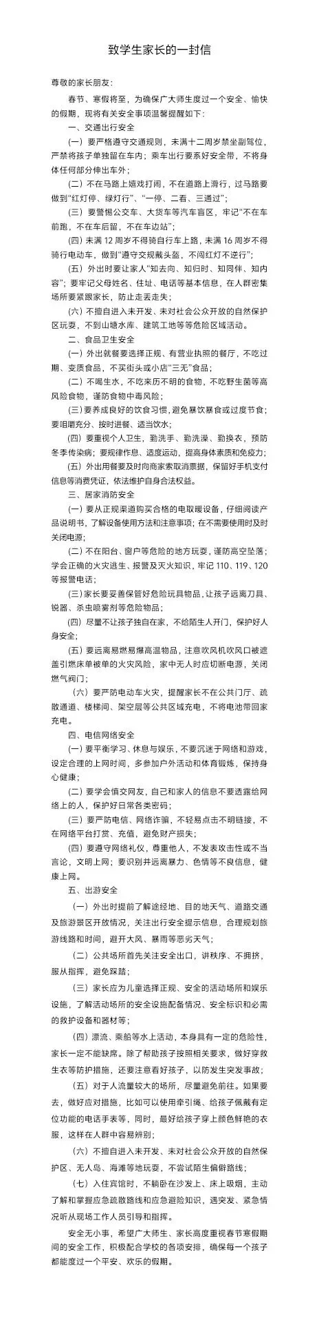 孩子的安全出行,离不开我们每一次的细心提醒和引导:请嘱咐孩子不要在马路上嬉戏,远离车辆盲区与路口危险区域;教导孩子遵守交规、不闯红灯、不翻越护栏,未满12周岁不骑车上路,乘车时不坐副驾驶位;若骑乘电动车,请务必为自己和孩子戴好安全头盔。让我们共同守护,把平安的种子融入日常,陪伴孩子稳稳前行。 独自在家时,不给陌生人开门;远离阳台、窗户等高空区域,不向楼下抛物;电动车不入户充电;离家牢记“三清三关”(清阳台、走道、厨房,关火、电、气)。春节临近,烟花爆竹燃放进入旺季。为守护孩子安全,温馨提醒:请远离非法烟花爆竹,不在禁放区域、人员密集场所燃放;燃放时务必看护好孩子,与烟花保持安全距离。